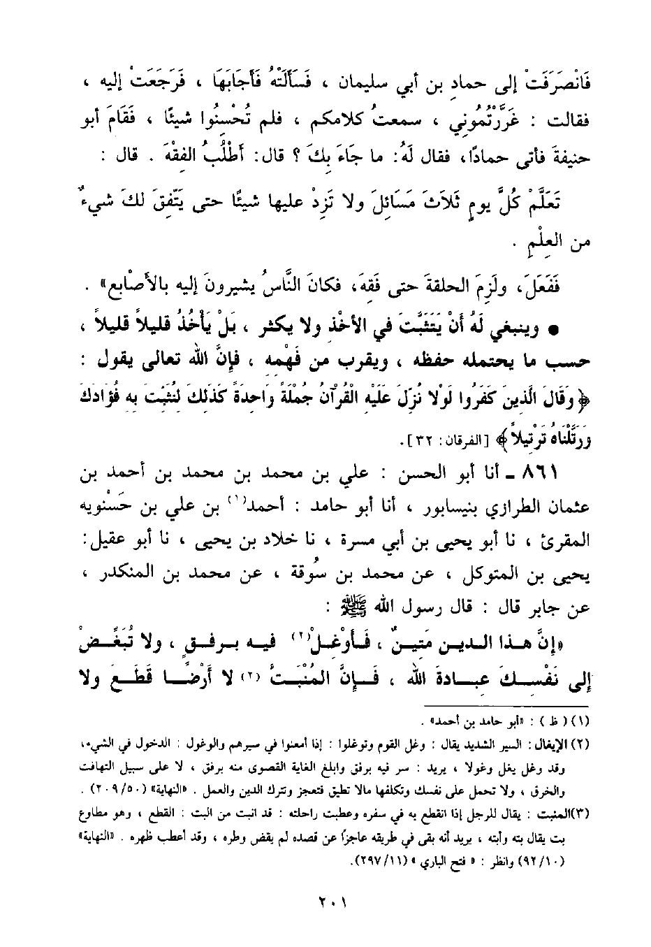 فَانْصَرَفْتُ إِلَى حَمَّادِ بْنِ أَبِي سُلَيْمَانَ , فَسَأَلْتُهُ فَأَجَابَهَا , فَرَجَعْتُ إِلَيْهِ , فَقَالَتْ: غَرَّرْتُمُونِي , سَمِعْتُ كَلَامَكُمْ , فَلَمْ تُحْسِنُوا شَيْئًا , فَقَامَ أَبُو حَنِيفَةَ فَأَتَى حَمَّادًا , فَقَالَ لَهُ: مَا جَاءَ بِكَ؟ قَالَ: أَطْلُبُ الْفِقْهَ قَالَ: تَعَلَّمْ كُلَّ يَوْمٍ ثَلَاثَ مَسَائِلَ وَلَا تَزِدْ عَلَيْهَا شَيْئًا حَتَّى يَتَّفِقَ لَكَ شَيْءٌ مِنَ الْعِلْمِ فَفَعَلَ , وَلَزِمَ الْحَلَقَةَ حَتَّى فَقِهَ , فَكَانَ النَّاسُ يُشِيرُونَ إِلَيْهِ بِالْأَصَابِعِ " وَيَنْبَغِي لَهُ أَنْ يَتَثَبِّتَ فِي الْأَخْذِ وَلَا يُكْثِرُ , بَلْ يَأْخُذُ قَلِيلًا قَلِيلًا , حَسْبَ مَا يَحْتَمِلُهُ حِفْظُهُ , وَيَقْرَبُ مِنْ فَهْمِهِ , فَإِنَّ اللَّهَ تَعَالَى يَقُولُ: {وَقَالَ الَّذِينَ كَفَرُوا لَوْلَا نُزِّلَ عَلَيْهِ الْقُرْآنُ جُمْلَةً وَاحِدَةً كَذَلِكَ لِنُثَبِّتَ بِهِ فُؤَادَكَ وَرَتَّلْنَاهُ تَرْتِيلًا} [الفرقان: ٣٢]