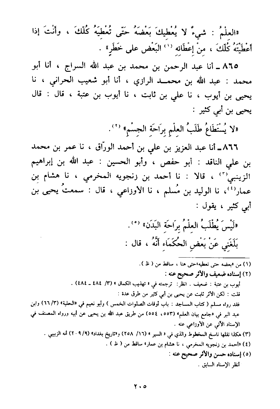 أنا عَبْدُ الرَّحْمَنِ بْنُ مُحَمَّدِ بْنِ عَبْدِ اللَّهِ السَّرَّاجُ , أنا أَبُو مُحَمَّدٍ: عَبْدُ اللَّهِ بْنُ مُحَمَّدٍ الرَّازِيُّ , أنا أَبُو شُعَيْبٍ الْحَرَّانِيُّ , نا يَحْيَى بْنُ أَيُّوبَ , نا عَلِيُّ بْنُ ثَابِتٍ , نا أَيُّوبُ بْنُ عُتْبَةَ , قَالَ: قَالَ يَحْيَى بْنُ أَبِي كَثِيرٍ: «لَا يُسْتَطَاعُ طَلَبُ الْعِلْمِ بِرَاحَةِ الْجِسْمِ»