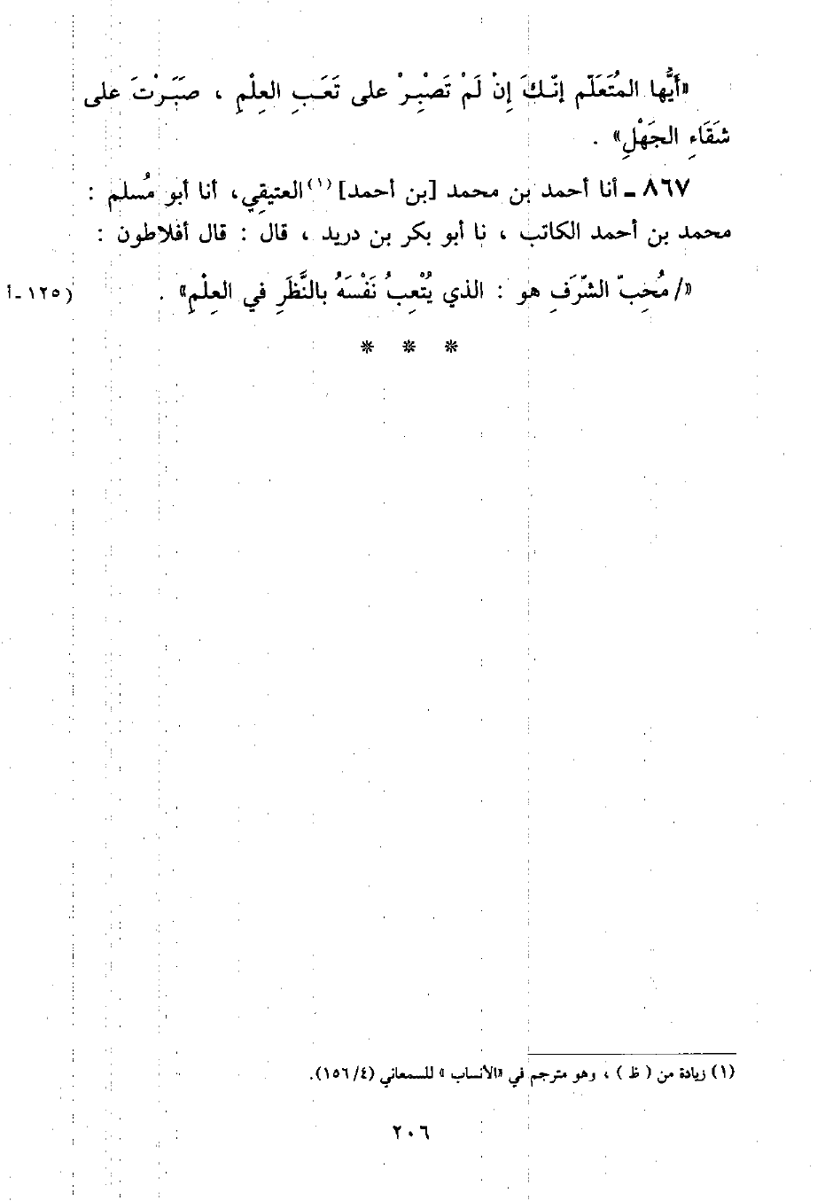 أنا أَحْمَدُ بْنُ مُحَمَّدِ بْنِ أَحْمَدَ الْعُتَيْقِيُّ , أنا أَبُو مُسْلِمٍ: مُحَمَّدُ بْنُ أَحْمَدَ الْكَاتِبُ , نا أَبُو بَكْرِ بْنُ دُرَيْدٍ , قَالَ: " قَالَ أَفْلَاطُونُ: مُحِبُّ الشَّرَفِ هُوَ: الَّذِي يُتْعِبُ نَفْسَهُ بِالنَّظَرِ فِي الْعِلْمِ "