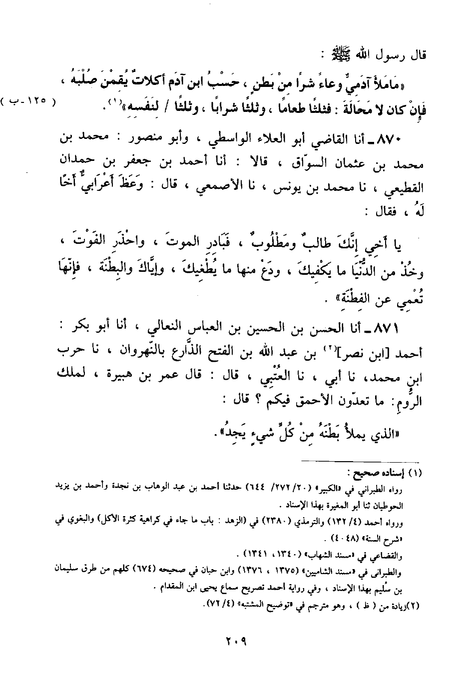 أنا الْقَاضِي أَبُو الْعَلَاءِ الْوَاسِطِيُّ , وأَبُومَنْصُورٍ مُحَمَّدُ بْنُ مُحَمَّدِ بْنِ عُثْمَانَ السَّوَّاقُ , قَالَا: أنا أَحْمَدُ بْنُ جَعْفَرِ بْنِ حَمْدَانَ الْقَطِيعِيُّ , نا مُحَمَّدُ بْنُ يُونُسَ , نا الْأَصْمَعِيُّ , قَالَ: وَعَظَ أَعْرَابِيٌّ أَخًا لَهُ , فَقَالَ: «يَا أَخِي إِنَّكَ طَالِبٌ وَمَطْلُوبٌ , فَبَادِرِ الْمَوْتَ , احْذَرِ الْفَوْتَ وَخُذْ مِنَ الدُّنْيَا مَا يَكْفِيكَ , وَدَعْ مِنْهَا مَا يُطْغِيكَ , وَإِيَّاكَ وَالْبِطْنَةَ , فَإِنَّهَا تُعْمِي عَنِ الْفِطْنَةِ»