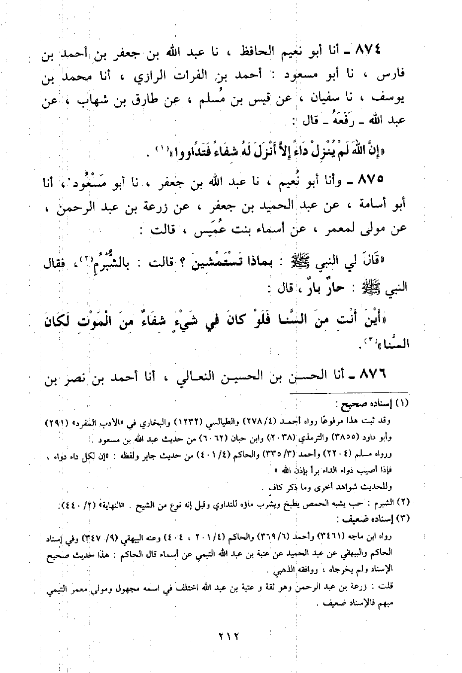 وأنا أَبُو نُعَيْمٍ , نا عَبْدُ اللَّهِ بْنُ جَعْفَرٍ , نا أَبُو مَسْعُودٍ , أنا أَبُو أُسَامَةَ , عَنْ عَبْدِ الْحَمِيدِ بْنِ جَعْفَرٍ , عَنْ زُرْعَةَ بْنِ عَبْدِ الرَّحْمَنِ , عَنْ مَوْلَى لِمَعْمَرٍ , عَنْ أَسْمَاءَ بِنْتِ عُمَيْسٍ , قَالَتْ: قَالَ لِيَ النَّبِيُّ صَلَّى اللهُ عَلَيْهِ وَسَلَّمَ: «بِمَاذَا تَسْتَمْشِينَ؟» قَالَتْ: بِالشُّبْرُمِ فَقَالَ النَّبِيُّ صَلَّى اللهُ عَلَيْهِ وَسَلَّمَ: «حَارٌّ بَارٌّ» , قَالَ: «أَيْنَ أَنْتِ مِنَ السَّنَا فَلَوْ كَانَ فِي شَيْءٍ شِفَاءٌ مِنَ الْمَوْتِ لَكَانَ السَّنَا»