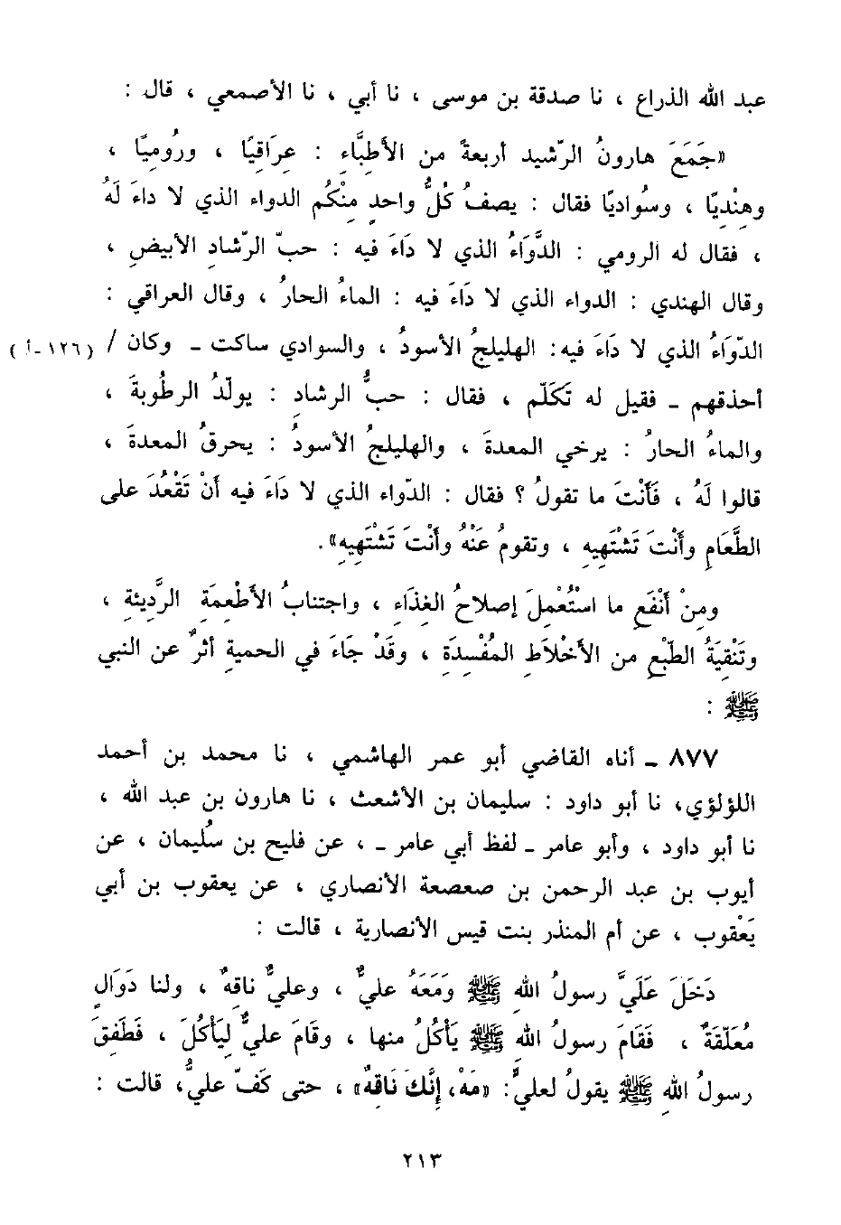 عَبْدِ اللَّهِ الذَّرَاعُ , نَا صَدَقَةُ بْنُ مُوسَى , نَا أَبِي , حَدَّثَنَا الْأَصْمَعِيُّ , قَالَ: " جَمَعَ هَارُونُ الرَّشِيدُ أَرْبَعَةً مِنَ الْأَطِبَّاءِ: عِرَاقِيًّا , وَرُومِيًّا , وَهِنْدِيًّا , سُوَادِيًّا فَقَالَ: يَصِفُ كُلُّ وَاحِدٍ مِنْكُمُ الدَّوَاءَ الَّذِي لَا دَاءَ لَهُ , فَقَالَ لَهُ الرُّومِيُّ: الدَّوَاءُ الَّذِي لَا دَاءَ فِيهِ: حَبُّ الرَّشَادِ الْأَبْيَضِ , وَقَالَ الْهِنْدِيُّ: الدَّوَاءُ الَّذِي لَا دَاءَ فِيهِ: الْمَاءُ الْحَارُّ , وَقَالَ الْعِرَاقِيُّ: الدَّوَاءُ الَّذِي لَا دَاءَ فِيهِ: الْهِلِيلَجُ الْأَسْوَدُ , وَالسُوَادِيُّ سَاكِتٌ , وَكَانَ أحَذْقَهُمْ فَقِيلَ لَهُ تَكَلَّمْ , فَقَالَ: حَبُّ الرَّشَادِ: يُوَلِّدُ الرُّطُوبَةَ , وَالْمَاءُ الْحَارُّ: يَرْخِي الْمَعِدَةُ , وَالْهِلِيلَجُ الْأَسْوَدُ: يَحْرِقُ الْمَعِدَةَ , قَالُوا لَهُ: فَأَنْتَ مَا تَقُولُ؟ فَقَالَ: الدَّوَاءُ الَّذِي لَا دَاءَ فِيهِ أَنْ تَقْعُدَ عَلَى الطَّعَامِ وَأَنْتَ تَشْتَهِيهِ , وَتَقُومُ عَنْهُ وَأَنْتَ تَشْتَهِيهِ " وَمِنْ أَنْفَعِ مَا اسْتُعْمِلَ إِصْلَاحُ الْغِذَاءِ , وَاجْتِنَابُ الْأَطْعِمَةِ الرَّدِيئَةِ , وَتَنْقِيَةُ الطَّبْعِ مِنَ الْأَخْلَاطِ الْمُفْسِدَةِ
