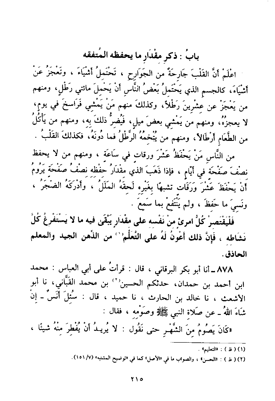 بَابُ: ذِكْرِ مِقْدَارِ مَا يَحْفَظُهُ الْمُتَفَقِّهُ اعْلَمْ أَنَّ الْقَلْبَ جَارِحَةٌ مِنَ الْجَوَارِحِ , تَحْتَمِلُ أَشْيَاءَ , وَتَعْجِزُ عَنْ أَشْيَاءَ , كَالْجِسْمِ الَّذِي يَحْتَمِلُ بَعْضَ النَّاسِ أَنْ يَحْمِلَ مِائَتَيْ رِطْلٍ , وَمِنْهُمْ مَنْ يَعْجَزُ عَنْ عِشْرِينَ رِطْلًا , وَكَذَلِكَ مِنْهُمْ مَنْ يَمْشِي فَرَاسِخَ فِي يَوْمٍ , لَا يُعْجِزُهُ , وَمِنْهُمْ مَنْ يَمْشِي بَعْضَ مِيلٍ , فَيَضُرُّ ذَلِكَ بِهِ , وَمِنْهُمْ مَنْ يَأْكُلُ مِنَ الطَّعَامِ أَرْطَالًا , وَمِنْهُمْ مَنْ يُتْخِمُهُ الرَّطْلُ فَمَا دُونَهُ , فَكَذَلِكَ الْقَلْبُ مِنَ النَّاسِ مَنْ يَحْفَظُ عَشْرَ وَرَقَاتٍ فِي سَاعَةٍ , وَمِنْهُمْ مَنْ لَا يَحْفَظُ نِصْفَ صَفْحَةٍ فِي أَيَّامٍ , فَإِذَا ذَهَبَ الَّذِي مِقْدَارُ حِفْظِهِ نِصْفُ صَفْحَةٍ يَرُومٌ أَنْ يَحْفَظَ عَشْرَ وَرَقَاتٍ تَشَبُّهًا بِغَيْرِهِ لَحِقَهُ الْمَلَلُ , وَأَدْرَكَهُ الضَّجَرُ , وَنَسِيَ مَا حَفِظَ , وَلَمْ يَنْتَفِعْ بِمَا سَمِعَ فَلْيَقْتَصِرْ كُلُّ امْرِئٍ مِنْ نَفْسِهِ عَلَى مِقْدَارٍ يَبْقَى فِيهِ مَا لَا يَسْتَفْرِغُ كُلَّ نَشَاطِهِ , فَإِنَّ ذَلِكَ أعونُ لَهُ عَلَى التَّعَلُّمِ مِنَ الذِّهْنِ الْجَيِّدِ وَالْمُعَلِّمُ الْحَاذِقُ