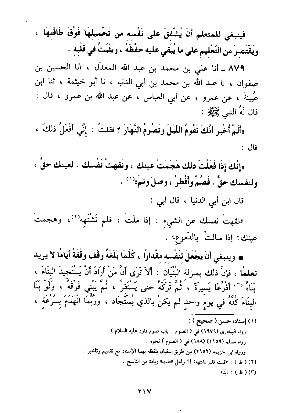 أنا عَلِيُّ بْنُ مُحَمَّدِ بْنِ عَبْدِ اللَّهِ الْمُعَدِّلِ , أنا الْحُسَيْنُ بْنُ صَفْوَانَ , نَا عَبْدُ اللَّهِ بْنُ مُحَمَّدِ بْنِ أَبِي الدُّنْيَا , نَا أَبُو خَيْثَمَةَ , ثَنَا ابْنُ عُيَيْنَةَ , عَنْ عَمْرٍو , عَنْ أَبِي الْعَبَّاسِ , عَنْ عَبْدِ اللَّهِ بْنِ عَمْرٍو , قَالَ: قَالَ لَهُ النَّبِيُّ صَلَّى اللهُ عَلَيْهِ وَسَلَّمَ: «أَلَمْ أُخْبَرْ أَنَّكَ تَقُومُ اللَّيْلَ وَتَصُومَ النَّهَارَ؟» فَقُلْتُ: إِنِّي أَفْعَلُ ذَلِكَ , قَالَ: «إِنَّكَ إِذَا فَعَلْتَ ذَلِكَ هَجَمَتْ عَيْنُكَ , وَنَقِهَتْ نَفْسُكَ لِعَيْنِكَ حَقٌّ , وَلِنَفْسِكَ حَقٌّ فَصُمْ وَأَفْطِرْ , وَصَلِّ وَنَمْ» قَالَ ابْنُ أَبِي الدُّنْيَا , قَالَ أَبِي: نَقِهَتْ نَفْسُكَ عَنِ الشَّيْءِ: إِذَا مَلَّتْ , فَلَمْ تَشْتَهِهِ وَهَجَمَتْ عَيْنُكَ: إِذَا سَالَتْ بِالدُّمُوعِ وَيَنْبَغِي أَنْ يَجْعَلَ لِنَفْسِهِ مِقْدَارًا , كُلَّمَا بَلَغَهُ وَقَفَ وَقْفَةً أَيَّامًا لَا يُرِيدُ تَعَلُّمًا , فَإِنَّ ذَلِكَ بِمَنْزِلَةِ الْبُنْيَانِ: أَلَا تَرَى أَنَّ مَنْ أَرَادَ أَنْ يَسْتَجِيدَ البِنَاءً , بَنَاهُ أَذْرُعًا يَسِيرَةً , ثُمَّ تَرَكَهُ حَتَّى يَسْتَقِرَّ , ثُمَّ يَبْنِي فَوْقَهُ , وَلَوْ بَنَى الْبِنَاءَ كُلَّهُ فِي يَوْمٍ وَاحِدٍ لَمْ يَكُنْ بِالَّذِي يُسْتَجَادُ , وَرُبَّمَا انْهَدَمَ بِسُرْعَةٍ ,