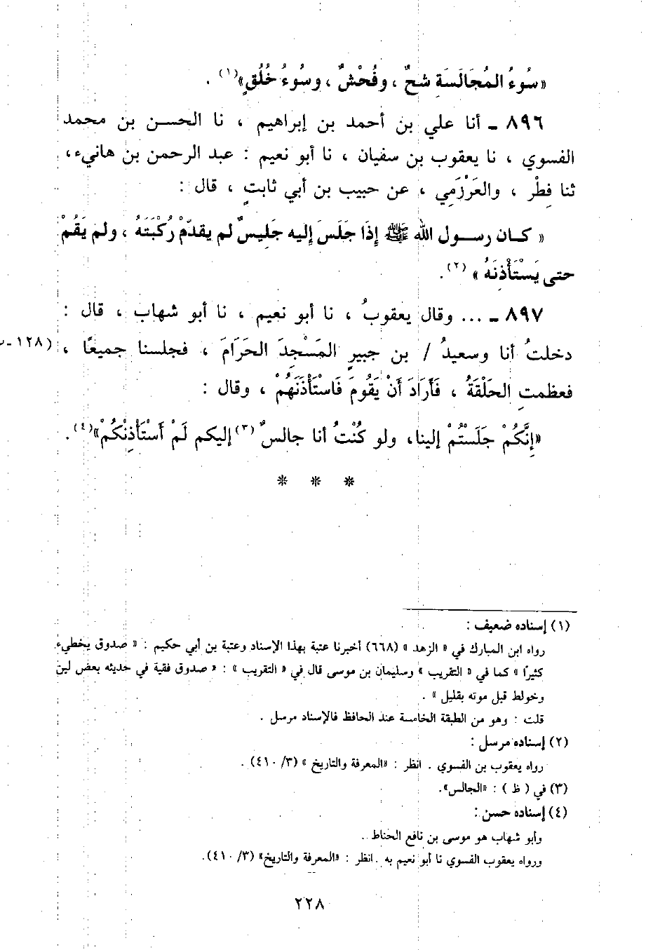 أنا عَلِيُّ بْنُ أَحْمَدَ بْنِ إِبْرَاهِيمَ , نا الْحَسَنُ بْنُ مُحَمَّدٍ الْفَسَوِيُّ , نا يَعْقُوبُ بْنُ سُفْيَانَ , نا أَبُو نُعَيْمٍ عَبْدُ الرَّحْمَنِ بْنُ هَانِئٍ , ثنا فِطْرٌ , وَالْعَرْزَمِيُّ , عَنْ حَبِيبِ بْنِ أَبِي ثَابِتٍ , قَالَ: كَانَ رَسُولُ اللَّهِ صَلَّى اللهُ عَلَيْهِ وَسَلَّمَ «إِذَا جَلَسَ إِلَيْهِ جَلِيسٌ لَمْ يُقَدِّمْ رُكْبَتَهْ , وَلَمْ يَقُمْ حَتَّى يَسْتَأْذِنَهُ»