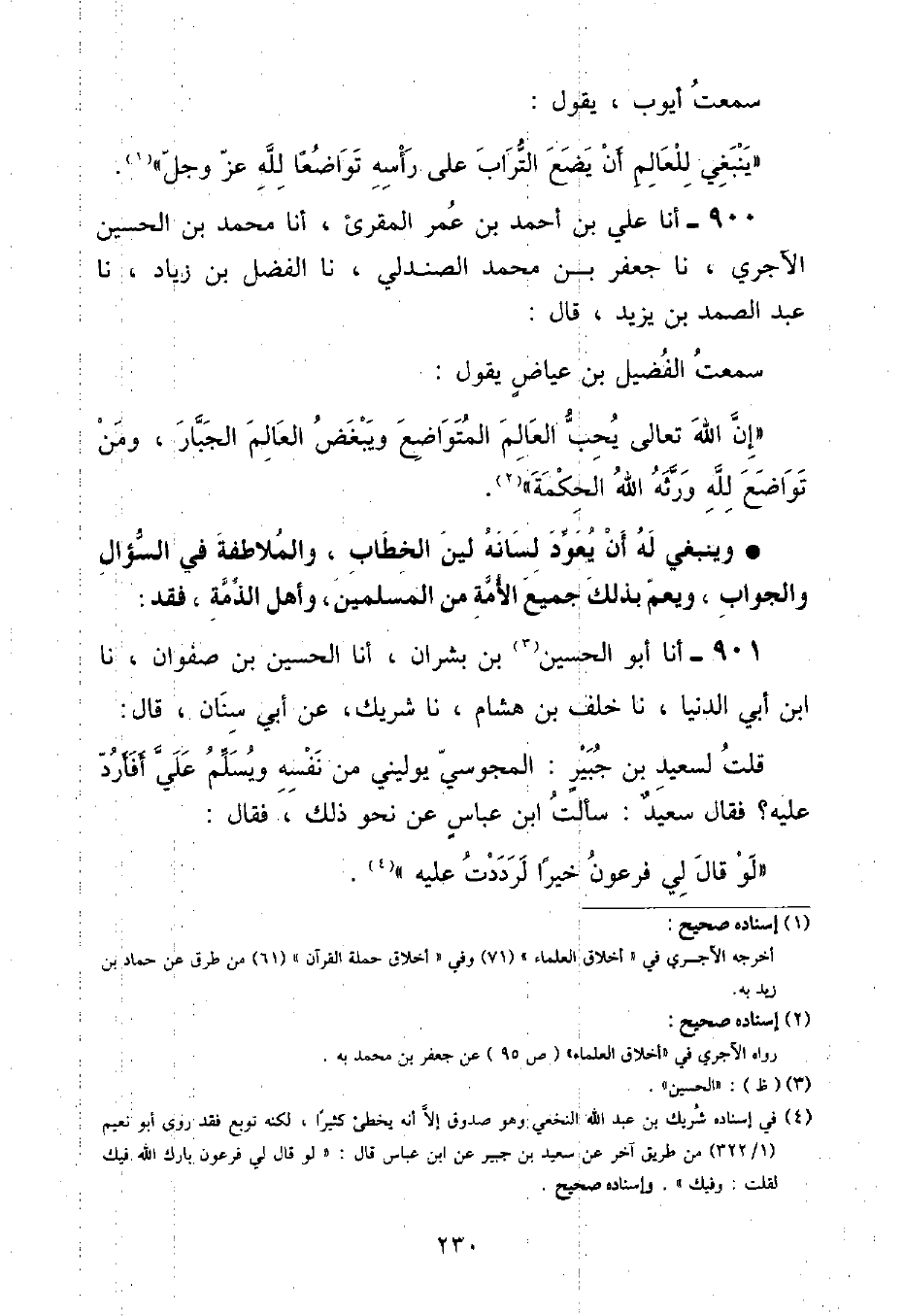 أنا عَلِيُّ بْنُ أَحْمَدَ بْنِ عُمَرَ الْمُقْرِئُ , أنا مُحَمَّدُ بْنُ الْحُسَيْنِ الْآجُرِّيُّ , نا جَعْفَرُ بْنُ مُحَمَّدٍ الصَّنْدَلِيُّ , " نا الْفَضْلُ بْنُ زِيَادٍ , نا عَبْدُ الصَّمَدِ بْنُ يَزِيدَ , قَالَ: سَمِعْتُ الْفُضَيْلَ بْنَ عِيَاضٍ , يَقُولُ: «إِنَّ اللَّهَ تَعَالَى يُحِبُّ الْعَالِمَ الْمُتَوَاضِعَ وَيُبْغِضُ الْعَالِمَ الْجَبَّارَ , وَمَنْ تَوَاضَعَ لِلَّهِ وَرَّثَهُ اللَّهُ الْحِكْمَةَ» وَيَنْبَغِي لَهُ أَنْ يُعَوِّدَ لِسَانَهُ لِينَ الْخِطَابِ , وَالْمُلَاطَفَةِ فِي السُّؤَالِ وَالْجَوَابِ , وَيَعُمُّ بِذَلِكَ جَمِيعَ الْأُمَّةِ مِنَ الْمُسْلِمِينَ , وَأَهْلِ الذِّمَّةِ