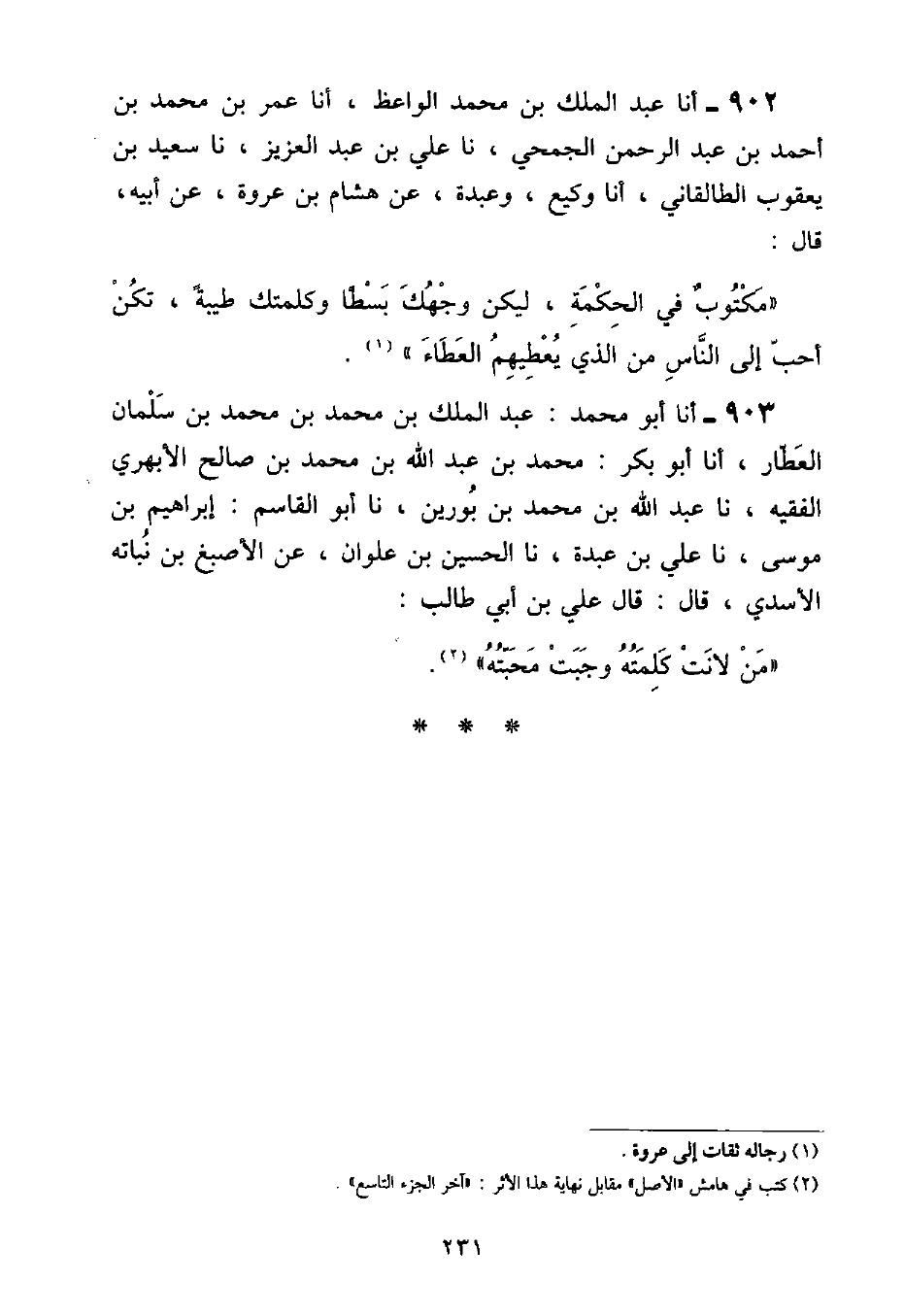 أنا عَبْدُ الْمَلِكِ بْنُ مُحَمَّدٍ الْوَاعِظُ , أنا عُمَرُ بْنُ مُحَمَّدِ بْنِ أَحْمَدَ بْنِ عَبْدِ الرَّحْمَنِ الْجُمَحِيُّ , نا عَلِيُّ بْنُ عَبْدِ الْعَزِيزِ , نا سَعِيدُ بْنُ يَعْقُوبَ الطَّالْقَانِيُّ , أنا وَكِيعٌ , وعَبْدَةُ , عَنْ هِشَامِ بْنِ عُرْوَةَ , عَنْ أَبِيهِ , قَالَ: «مَكْتُوبٌ فِي الْحِكْمَةِ , لِيَكُنْ وَجْهُكَ بَسْطًا وَكَلِمَتُكَ طَيْبَةً , تَكُنُ أَحَبَّ إِلَى النَّاسِ مِنَ الَّذِي يُعْطِيهِمُ الْعَطَاءَ»