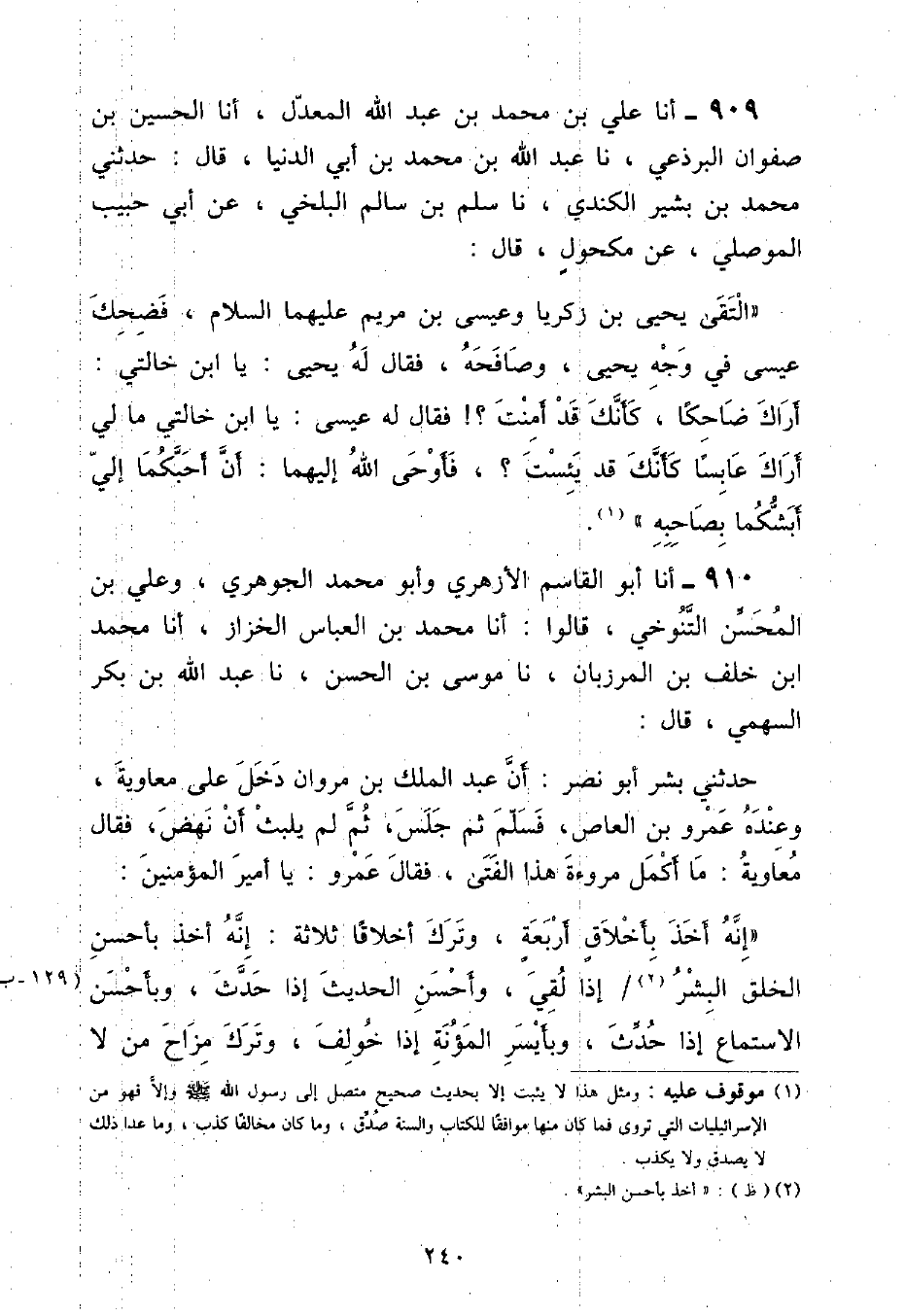 أنا أَبُو الْقَاسِمِ الْأَزْهَرِيُّ , وَأَبُو مُحَمَّدٍ الْجَوْهَرِيُّ , وَعَلِيُّ بْنُ الْمُحْسِنِ التَّنُوخِيُّ , قَالُوا: أنا مُحَمَّدُ بْنُ الْعَبَّاسِ الْخَزَّازُ , أنا مُحَمَّدُ بْنُ خَلَفِ بْنِ الْمَرْزَبَانِ , نا مُوسَى بْنُ الْحَسَنِ , نا عَبْدُ اللَّهِ بْنُ بَكْرٍ السَّهْمِيُّ , قَالَ: حَدَّثَنِي بِشْرٌ أَبُو نَصْرٍ أَنَّ عَبْدَ الْمَلِكِ بْنَ مَرْوَانَ , دَخَلَ عَلَى مُعَاوِيَةَ , وَعِنْدَهُ عَمْرُو بْنُ الْعَاصِ , فَسَلَّمَ ثُمَّ جَلَسَ , ثُمَّ لَمْ يَلْبَثْ أَنْ نَهَضَ , فَقَالَ مُعَاوِيَةُ: مَا أَكْمَلَ مُرُوءَةَ هَذَا الْفَتَى , فَقَالَ عَمْرٌو: يَا أَمِيرَ الْمُؤْمِنِينَ: " إِنَّهُ أَخَذَ بِأَخْلَاقٍ أَرْبَعَةٍ , وَتَرَكَ أَخْلَاقًا ثَلَاثَةً: إِنَّهُ أَخَذَ بِأَحْسَنِ الْخُلُقِ الْبِشْرِ إِذَا لَقِيَ , وَأَحْسَنِ الْحَدِيثِ إِذَا حَدَّثَ , وَبِأَحْسَنِ الِاسْتِمَاعِ إِذَا حُدِّثَ , وَبِأَيْسَرِ الْمُؤْنَةِ إِذَا خُولِفَ , وَتَرَكَ مِزَاحَ مَنْ لَا ⦗٢٤١⦘ يُوثَقُ بِعَقْلِهِ وَلَا دِينِهِ , وَتَرَكَ مُجَالَسَةَ لِئَامِ النَّاسِ , وَتَرَكَ مِنَ الْكَلَامِ مَا يُعْتَذَرُ مِنْهُ " وَيَنْبَغِي لِلْفَقِيهِ أَنْ يَتَأَلَّفَ الْمُتَفَقِّهَةَ بِالْمَعُونَةِ لَهُمْ عَلَى حَسْبِ إِمْكَانِهِ وَالِانْبِسَاطِ إِلَيْهِمْ وَالتَّخَلُّقِ مَعَهُمْ