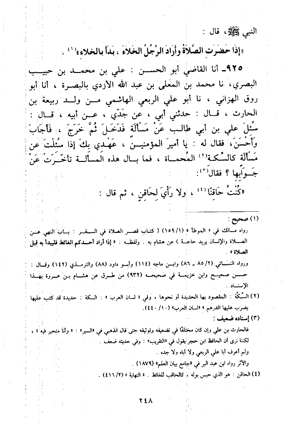 أنا الْقَاضِي أَبُو الْحَسَنِ: عَلِيُّ بْنُ مُحَمَّدِ بْنِ حَبِيبٍ الْبَصْرِيُّ , نَا مُحَمَّدُ بْنُ الْمُعَلَّى بْنِ عَبْدِ اللَّهِ الْأَزْدِيُّ , بِالْبَصْرَةِ , أنا أَبُو رَوْقٍ الْهِزَّانِيِّ , نَا أَبُو عَلِيٍّ الرَّبَعِيُّ الْهَاشِمِيُّ , مِنْ وَلَدِ رَبِيعَةَ بْنِ الْحَارِثِ , قَالَ: حَدَّثَنِي أَبِي , عَنْ جَدِّي , عَنْ أَبِيهِ , قَالَ: سُئِلَ عَلِيُّ بْنُ أَبِي طَالِبٍ عَنْ مَسْأَلَةٍ , فَدَخَلَ ثُمَّ خَرَجَ , فَأَجَابَ وَأَحْسَنَ , فَقَالَ لَهُ: يَا أَمِيرَ الْمُؤْمِنِينَ , عَهْدِي بِكَ إِذَا سُئِلْتَ عَنْ مَسْأَلَةٍ كَالسِّكَّةِ الْمُحْمَاةِ , فَمَا بَالُ هَذِهِ الْمَسْأَلَةِ تَأَخَّرْتَ عَنْ جَوَابِهَا؟ فَقَالَ: " كُنْتُ حَاقِنًا , وَلَا رَأْيَ لِحَاقِنٍ , ثُمَّ قَالَ: