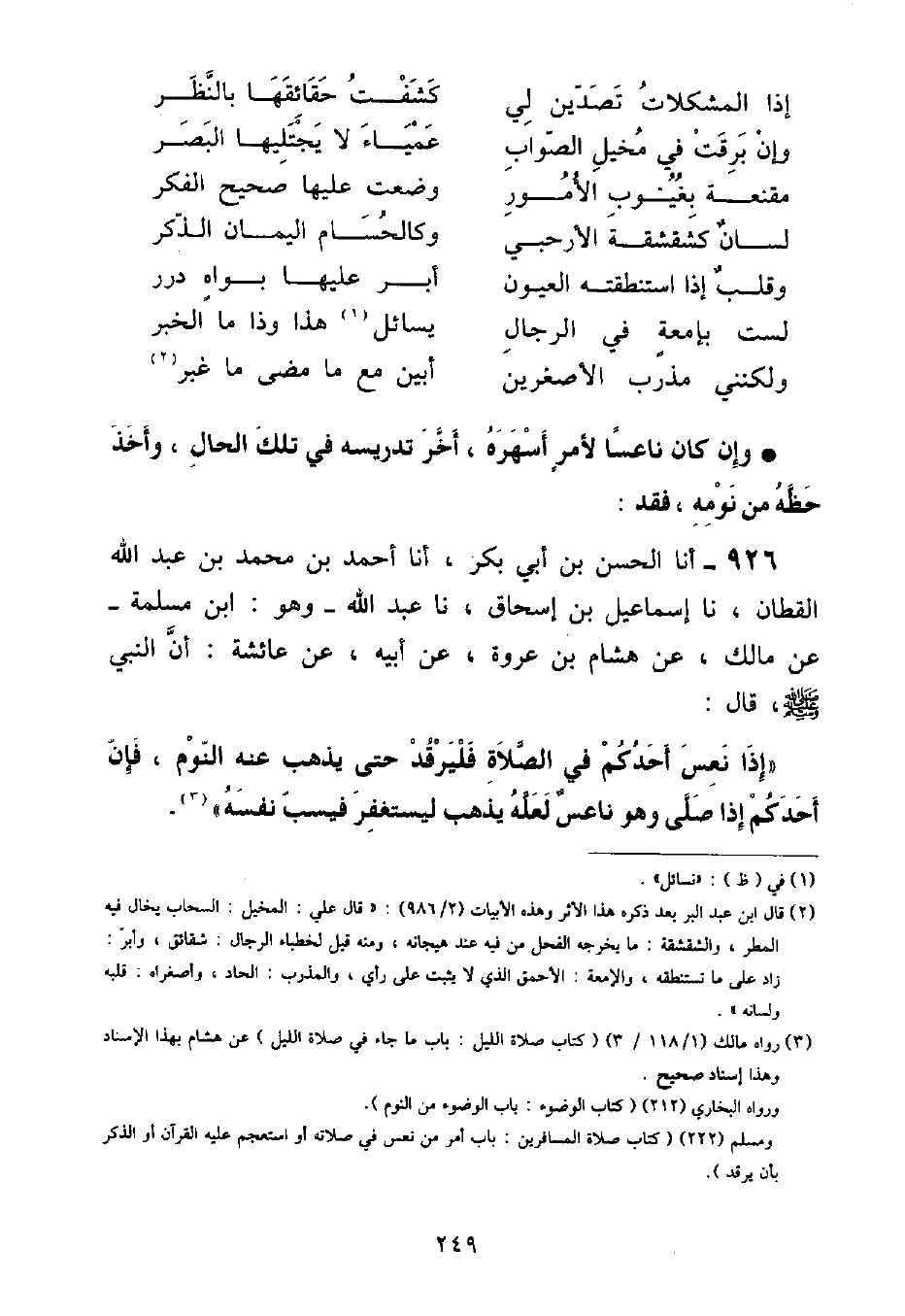 وَإِنْ كَانَ نَاعِسًا لِأَمْرٍ أَسْهَرَهُ , أَخَّرَ تَدْرِيسَهُ فِي تِلْكَ الْحَالِ , وَأَخَذَ حَظَّهُ مِنْ نَوْمِهِ , فَقَدْ: أنا الْحَسَنُ بْنُ أَبِي بَكْرٍ , أنا أَحْمَدُ بْنُ مُحَمَّدِ بْنِ عَبْدِ اللَّهِ الْقَطَّانُ , نا إِسْمَاعِيلُ بْنُ إِسْحَاقَ , نا عَبْدُ اللَّهِ , وَهُوَ ابْنُ مَسْلَمَةَ عَنْ مَالِكٍ , عَنْ هِشَامِ بْنِ عُرْوَةَ , عَنْ أَبِيهِ , عَنْ عَائِشَةَ: أَنَّ النَّبِيَّ صَلَّى اللهُ عَلَيْهِ وَسَلَّمَ , قَالَ: «إِذَا نَعَسَ أَحَدُكُمْ فِي الصَّلَاةِ فَلْيَرْقُدْ حَتَّى يَذْهَبَ عَنْهُ النَّوْمُ , فَإِنَّ أَحَدَكُمْ إِذَا صَلَّى وَهُوَ نَاعِسٌ لَعَلَّهُ يَذْهَبُ لَيَسْتَغْفِرَ فَيَسُبَّ نَفْسَهُ» ⦗٢٥٠⦘ وَلَا يَخْرُجُ إِلَّا طَيِّبَ النَّفْسِ , فَارِغَ الْقَلْبِ مِنْ كُلِّ مَا يَشْغَلُ السِّرَّ , فَإِذَا صَارَ إِلَى مَجْلِسِهِ , وَاجْتَمَعَ إِلَيْهِ أَصْحَابُهُ , فَلَا يَخْلُو مِنْ أَنْ يَكُونُ عَادَتُهُ أَنْ يَذْكُرَ لِلْجَمَاعَةِ دُرُوسًا مُخْتَلِفَةً , لِكُلِّ طَائِفَةٍ مِنْهُمْ دَرْسًا , أَوْ يَذْكُرُ لِجَمِيعِهِمْ دَرْسًا وَاحِدًا هُمْ فِيهِ مُشْتَرِكُونَ , وَعَلَى اخْتِيَارِهِ مُتَّفِقُونَ