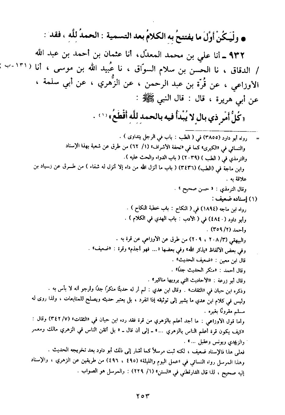 وَلْيَكُنْ أَوَّلَ مَا يَفْتَتِحُ بِهِ الْكَلَامَ بَعْدَ التَّسْمِيَةِ: الْحَمْدُ لِلَّهِ , فَقَدْ: أنا عَلِيُّ بْنُ مُحَمَّدٍ الْمُعَدِّلِ , أنا عُثْمَانُ بْنُ أَحْمَدَ بْنِ عَبْدِ اللَّهِ بْنِ الدَّقَّاقِ , نا الْحَسَنُ بْنُ سَلَّامٍ السَّوَّاقُ , نا عُبَيْدُ اللَّهِ بْنُ مُوسَى , أنا الْأَوْزَاعِيُّ , عَنْ قُرَّةَ بْنِ عَبْدِ الرَّحْمَنِ , عَنِ الزُّهْرِيِّ , عَنْ أَبِي سَلَمَةَ , عَنْ أَبِي هُرَيْرَةَ , قَالَ: قَالَ النَّبِيُّ صَلَّى اللهُ عَلَيْهِ وَسَلَّمَ: «كُلُّ أَمْرٍ ذِي بَالٍ لَا يُبْدَأُ فِيهِ بِالْحَمْدِ لِلَّهِ أَقْطَعُ»