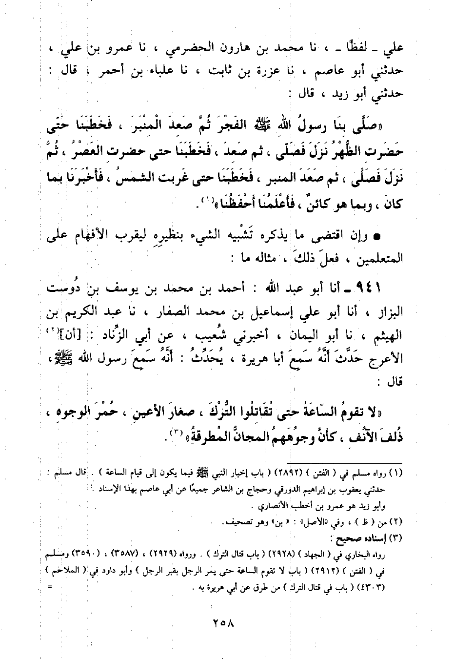 وَإِنْ اقْتَضَى مَا يَذْكُرُهُ تَشْبِيهَ الشَّيْءِ بِنَظِيرِهِ لِيَقْرَبَ الْأَفْهَامَ عَلَى الْمُتَعَلِّمِينَ , فَعَلَ ذَلِكَ , مِثَالُهُ مَا: أنا أَبُو عَبْدِ اللَّهِ: أَحْمَدُ بْنُ مُحَمَّدِ بْنِ يُوسُفَ بْنِ دَوَسْتَ الْبَزَّازُ , أنا أَبُو عَلِيٍّ , إِسْمَاعِيلُ بْنُ مُحَمَّدٍ الصَّفَّارُ , نا عَبْدُ الْكَرِيمِ بْنُ الْهَيْثَمِ , نا أَبُو الْيَمَانِ , أَخْبَرَنِي شُعَيْبٌ , عَنْ أَبِي الزِّنَادِ: أَنَّ الْأَعْرَجَ , حَدَّثَ أَنَّهُ , سَمِعَ أَبَا هُرَيْرَةَ , يُحَدِّثُ: أَنَّهُ سَمِعَ رَسُولَ اللَّهِ صَلَّى اللهُ عَلَيْهِ وَسَلَّمَ قَالَ: «لَا تَقُومُ السَّاعَةُ حَتَّى تُقَاتِلُوا التُّرْكَ , صِغَارَ الْأَعْيُنِ , حُمْرَ الْوُجُوهِ , ذُلْفَ الْآنُفِ , كَأَنَّ وُجُوهَهُمُ الْمَجَانُّ الْمُطْرَقَةُ»