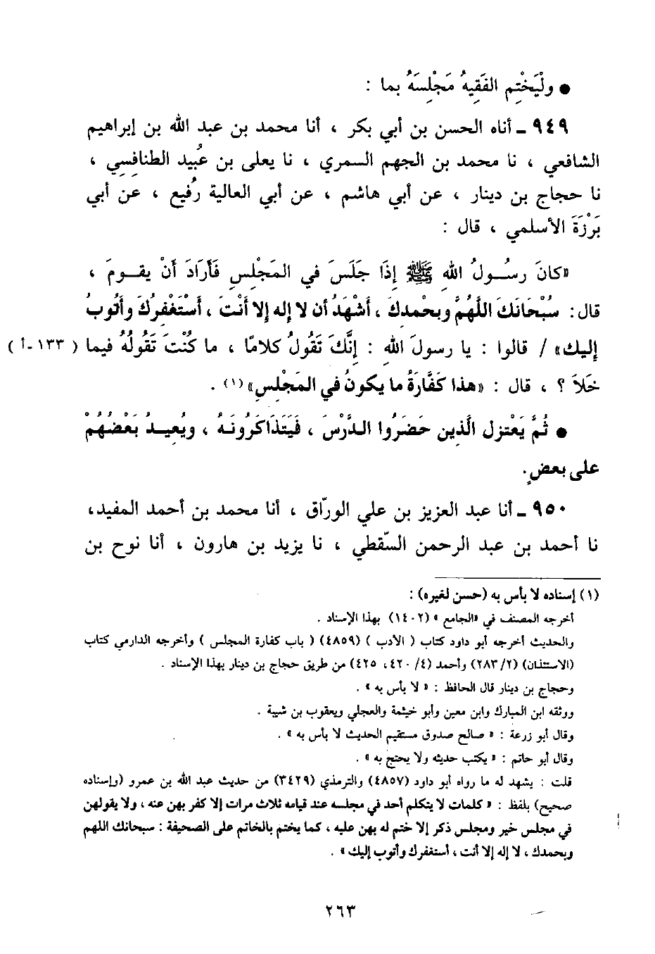 وَلْيَخْتِمِ الْفَقِيهُ مَجْلِسَهُ بِمَا: أناه الْحَسَنُ بْنُ أَبِي بَكْرٍ , أنا مُحَمَّدُ بْنُ عَبْدِ اللَّهِ بْنِ إِبْرَاهِيمَ الشَّافِعِيُّ , نا مُحَمَّدُ بْنُ الْجَهْمِ السَّمَرِيُّ , نا يَعْلَى بْنُ عُبَيْدٍ الطَّنَافِسِيُّ , نا حَجَّاجُ بْنُ دِينَارٍ , عَنْ أَبِي هَاشِمٍ , عَنْ أَبِي الْعَالِيَةِ , رُفَيْعٍ , عَنْ أَبِي بَرْزَةَ الْأَسْلَمَيِّ , قَالَ: كَانَ رَسُولُ اللَّهِ صَلَّى اللهُ عَلَيْهِ وَسَلَّمَ إِذَا جَلَسَ فِي الْمَجْلِسِ فَأَرَادَ أَنْ يَقُومَ , قَالَ: «سُبْحَانَكَ اللَّهُمَّ وَبِحَمْدِكَ , أَشْهَدُ أَنْ لَا إِلَهَ إِلَّا أَنْتَ , أَسْتَغْفِرُكَ وَأَتُوبُ إِلَيْكَ» قَالُوا: يَا رَسُولَ اللَّهِ: إِنَّكَ تَقُولُ كَلَامًا , مَا كُنْتَ تَقُولُهُ فِيمَا خَلَا؟ قَالَ: «هَذَا كَفَّارَةُ مَا يَكُونُ فِي الْمَجْلِسِ»