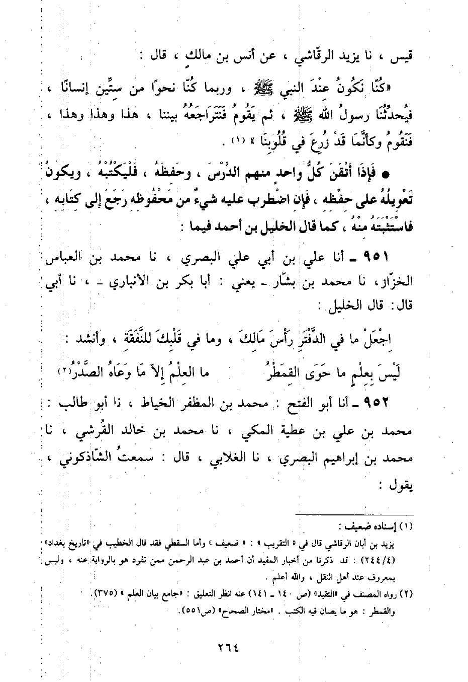 أنا أَبُو الْفَتْحِ مُحَمَّدُ بْنُ الْمُظَفَّرِ الْخَيَّاطُ , نا أَبُو طَالِبٍ مُحَمَّدُ بْنُ عَلِيِّ بْنِ عَطِيَّةَ الْمَكِّيُّ , نا مُحَمَّدُ بْنُ خَالِدٍ الْقُرَشِيُّ , نا مُحَمَّدُ بْنُ إِبْرَاهِيمَ الْبَصْرِيُّ , نا الْغَلَابِيُّ , قَالَ: سَمِعْتُ الشَّاذَكُونِيَّ , يَقُولُ ⦗٢٦٥⦘: «لَيْسَ الْعِلْمُ إِلَّا مَا دَخَلْتَ بِهِ الْحَمَّامُ»