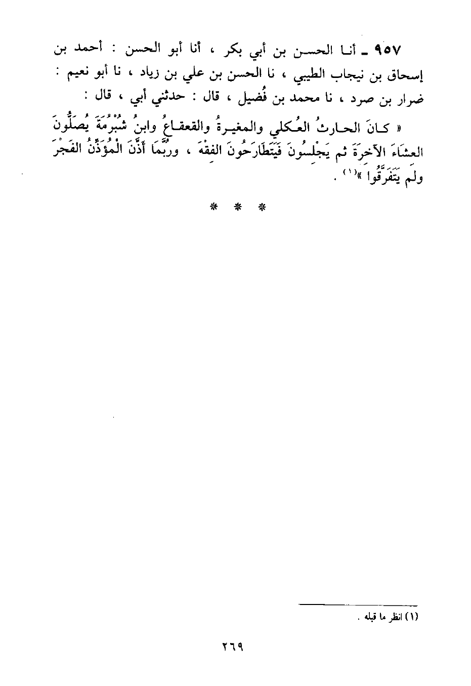 أنا الْحَسَنُ بْنُ أَبِي بَكْرٍ , أنا أَبُو الْحَسَنِ أَحْمَدُ بْنُ إِسْحَاقَ بْنِ مِنْجَابٍ الطِّيبِيُّ , نا الْحَسَنُ بْنُ عَلِيِّ بْنِ زِيَادٍ , نا أَبُو نُعَيْمٍ ضِرَارُ بْنُ صُرَدَ , نا مُحَمَّدُ بْنُ فُضَيْلٍ , قَالَ: حَدَّثَنِي أَبِي , قَالَ: «كَانَ الْحَارِثُ الْعُكْلِيُّ وَالْمُغِيرَةُ وَالْقَعْقَاعُ وَابْنُ شُبْرُمَةَ يُصَلُّونَ الْعِشَاءَ الْآخِرَةَ ثُمَّ يَجْلِسُونَ فَيَتَطَارَحُونَ الْفِقْهَ , وَرُبَّمَا أَذَّنَ الْمُؤَذِّنُ الْفَجْرَ وَلَمْ يَتَفَرَّقُوا»