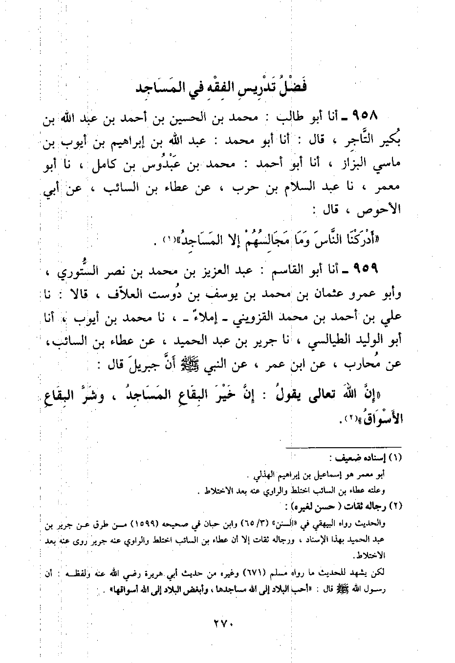 أنا أَبُو الْقَاسِمِ عَبْدُ الْعَزِيزِ بْنُ مُحَمَّدِ بْنِ نَصْرٍ السُّتُورِيُّ , وأَبُوعَمْرٍو عُثْمَانُ بْنُ مُحَمَّدِ بْنِ يُوسُفَ بْنِ دُوسَتَ الْعَلَّافُ , قَالَا: نا عَلِيُّ بْنُ أَحْمَدَ بْنِ مُحَمَّدٍ الْقَزْوِينِيُّ , إِمْلَاءً , نا مُحَمَّدُ بْنُ أَيُّوبَ , أنا أَبُو الْوَلِيدِ الطَّيَالِسِيُّ , نا جَرِيرُ بْنُ عَبْدِ الْحَمِيدِ , عَنْ عَطَاءِ بْنِ السَّائِبِ , عَنْ مُحَارِبٍ , عَنِ ابْنِ عُمَرَ , عَنِ النَّبِيِّ صَلَّى اللهُ عَلَيْهِ وَسَلَّمَ أَنَّ جِبْرِيلَ قَالَ: إِنَّ اللَّهَ تَعَالَى يَقُولُ: «إِنَّ خَيْرَ الْبِقَاعِ الْمَسَاجِدُ , وَشَرَّ الْبِقَاعِ الْأَسْوَاقُ»