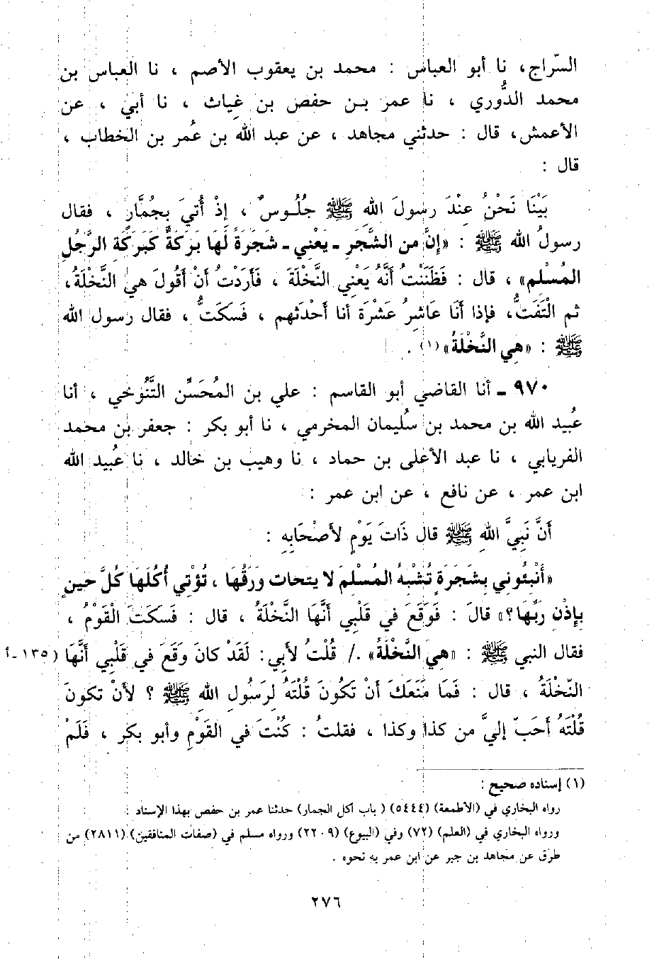 أنا الْقَاضِي أَبُو الْقَاسِمِ عَلِيُّ بْنُ الْمُحْسِنِ التَّنُوخِيُّ , أنا عُبَيْدُ اللَّهِ بْنُ مُحَمَّدِ بْنِ سُلَيْمَانَ الْمُخَرِّمِيُّ , نا أَبُو بَكْرٍ جَعْفَرُ بْنُ مُحَمَّدٍ الْفِرْيَابِيُّ , نا عَبْدُ الْأَعْلَى بْنُ حَمَّادٍ , نا وهَيْبُ بْنُ خَالِدٍ , نا عُبَيْدُ اللَّهِ بْنُ عُمَرَ , عَنْ نَافِعٍ , عَنِ ابْنِ عُمَرَ: أَنَّ نَبِيَّ اللَّهِ صَلَّى اللهُ عَلَيْهِ وَسَلَّمَ قَالَ ذَاتَ يَوْمٍ لِأَصْحَابِهِ: «أَنْبِئُونِي بِشَجَرَةٍ تُشْبِهُ الْمُسْلِمَ لَا يَتَحَارَثُ وَرَقُهَا , تُؤْتِي أُكُلَهَا كُلَّ حِينٍ بِإِذْنِ رَبِّهَا؟» قَالَ: فَوَقَعَ فِي قَلْبِي أَنَّهَا النَّخْلَةُ , قَالَ: فَسَكَتَ الْقَوْمُ , فَقَالَ النَّبِيُّ صَلَّى اللهُ عَلَيْهِ وَسَلَّمَ: «هِيَ النَّخْلَةُ» , قُلْتُ لِأَبِي: لَقَدْ كَانَ وَقَعَ فِي قَلْبِي أَنَّهَا النَّخْلَةُ , قَالَ: فَمَا مَنَعَكَ أَنْ تَكُونَ قُلْتَهُ لِرَسُولِ اللَّهِ صَلَّى اللهُ عَلَيْهِ وَسَلَّمَ؟ لِأَنْ تَكُونَ قُلْتَهُ أَحَبُّ إِلَيَّ مِنْ كَذَا وَكَذَا , فَقُلْتُ: كُنْتَ فِي الْقَوْمِ وأَبُوبَكْرٍ , فَلَمْ ⦗٢٧٧⦘ تَقُولَا شَيْئًا , فَكَرِهْتُ أَنْ أَقُولَ