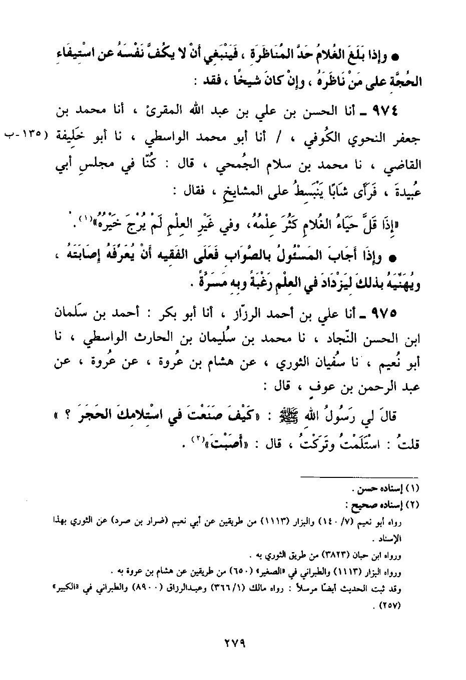 وَإِذَا أَجَابَ الْمَسْئُولُ بِالصَّوَابِ فَعَلَى الْفَقِيهِ أَنْ يُعَرِّفَهُ إِصَابَتَهُ , وَيُهَنِّيهِ بِذَلِكَ لِيَزْدَادَ فِي الْعِلْمِ رَغْبَةً وَبِهِ مَسَرَّةً أنا عَلِيُّ بْنُ أَحْمَدَ الرَّزَّازُ , أنا أَبُو بَكْرٍ: أَحْمَدُ بْنُ سَلْمَانَ بْنِ الْحَسَنِ النِّجَادُ , نا مُحَمَّدُ بْنُ سُلَيْمَانَ بْنِ الْحَارِثِ الْوَاسِطِيُّ , نا أَبُو نُعَيْمٍ , نا سُفْيَانُ الثَّوْرِيُّ , عَنْ هِشَامِ بْنِ عُرْوَةَ , عَنْ عُرْوَةَ , عَنْ عَبْدِ الرَّحْمَنِ بْنِ عَوْفٍ , قَالَ: قَالَ لِي رَسُولُ اللَّهِ صَلَّى اللهُ عَلَيْهِ وَسَلَّمَ: «كَيْفَ صَنَعْتَ فِي اسْتِلَامِكَ الْحَجَرَ؟» قُلْتُ: اسْتَلَمْتُ وَتَرَكْتُ , قَالَ: «أَصَبْتَ»
