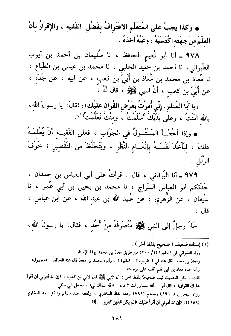 وَكَذَا يَجِبُ عَلَى الْمُتَعَلِّمِ الِاعْتِرَافُ بِفَضْلِ الْفَقِيهِ , وَالْإِقْرَارُ بِأَنَّ الْعِلْمَ مِنْ جِهَتِهِ اكْتَسَبَهُ , وَعَنْهُ أَخَذَهُ أنا أَبُو نُعَيْمٍ الْحَافِظُ , نا سُلَيْمَانُ بْنُ أَحْمَدَ بْنِ أَيُّوبَ الطَّبَرَانِيُّ , نا أَحْمَدُ بْنُ خُلَيْدٍ الْحَلَبِيُّ , نا مُحَمَّدُ بْنُ عِيسَى بْنِ الطَّبَّاعِ , نا مُعَاذُ بْنُ مُحَمَّدِ بْنِ مُعَاذِ بْنِ أُبَيِّ بْنِ كَعْبٍ , عَنْ أَبِيهِ , عَنْ جَدِّهِ , عَنْ أُبَيِّ بْنِ كَعْبٍ , أَنَّ النَّبِيَّ صَلَّى اللهُ عَلَيْهِ وَسَلَّمَ , قَالَ لَهُ: «يَا أَبَا الْمُنْذِرِ , إِنِّي أُمِرْتُ بِعَرْضِ الْقُرْآنِ عَلَيْكَ» , فَقَالَ: يَا رَسُولَ اللَّهِ , بِاللَّهِ آمَنْتَ , وَعَلَى يَدَيْكَ أَسْلَمْتُ , وَمِنْكَ تَعَلَّمْتُ