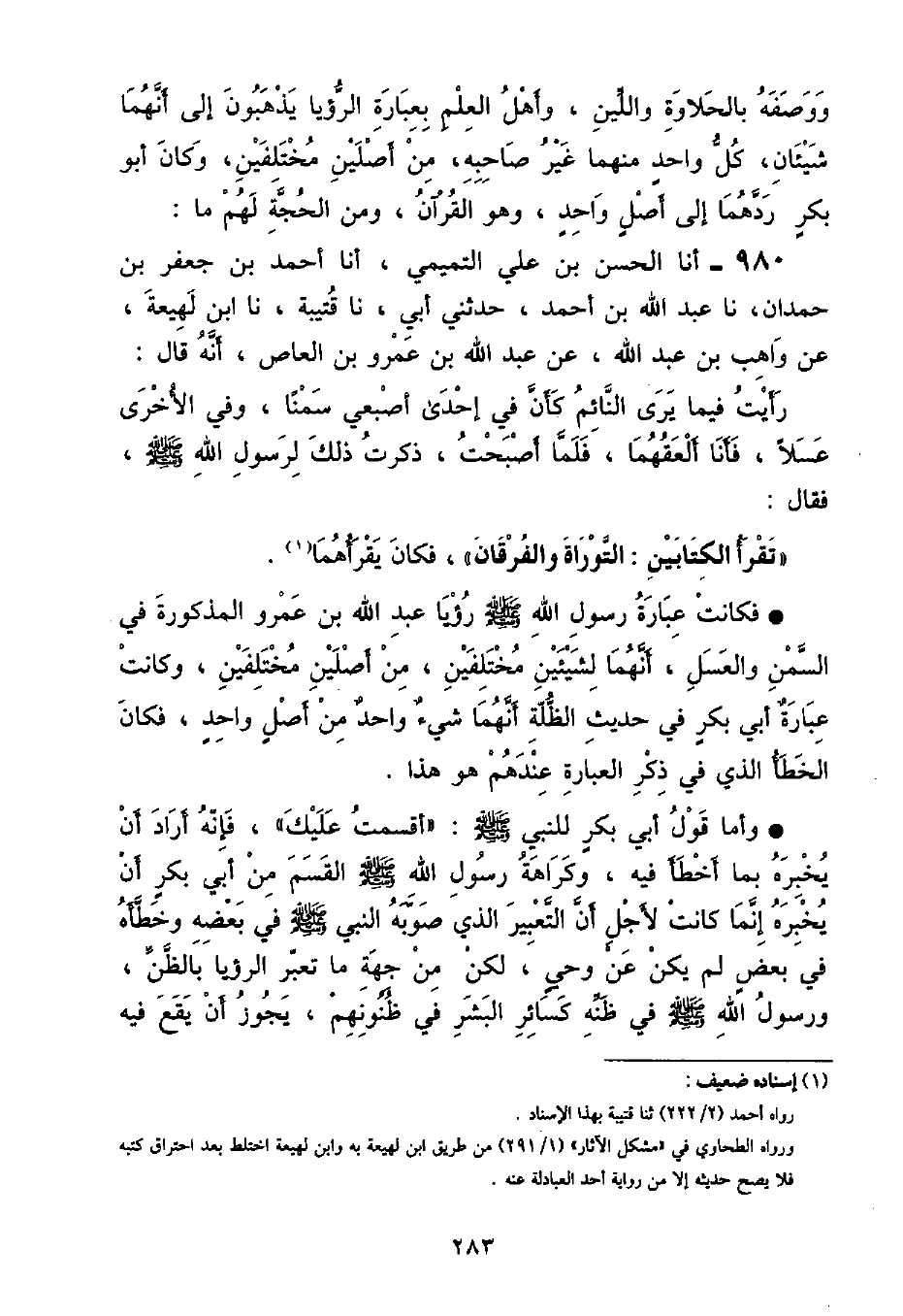 وَمِنَ الْحُجَّةِ لَهُمْ مَا أنا الْحَسَنُ بْنُ عَلِيٍّ التَّمِيمِيُّ , أنا أَحْمَدُ بْنُ جَعْفَرِ بْنِ حَمْدَانَ , نا عَبْدُ اللَّهِ بْنُ أَحْمَدَ , حَدَّثَنِي أَبِي , نا قُتَيْبَةُ , نا ابْنُ لَهِيعَةَ , عَنْ واهِبِ بْنِ عَبْدِ اللَّهِ , عَنْ عَبْدِ اللَّهِ بْنِ عَمْرِو بْنِ الْعَاصِ , أَنَّهُ قَالَ: رَأَيْتُ فِيمَا يَرَى النَّائِمُ كَأَنَّ فِي إِحْدَى إِصْبَعِي سَمْنًا , وَفِي الْأُخْرَى عَسَلًا , فَأَنَا أَلْعَقُهُمَا , فَلَمَّا أَصْبَحْتُ , ذَكَرْتُ ذَلِكَ لِرَسُولِ اللَّهِ صَلَّى اللهُ عَلَيْهِ وَسَلَّمَ فَقَالَ: " تَقْرَأُ الْكِتَابَيْنِ: التَّوْرَاةَ وَالْفُرْقَانَ " فَكَانَ يَقْرَأْهُمَا فَكَانَتْ عِبَارَةُ رَسُولِ اللَّهِ صَلَّى اللهُ عَلَيْهِ وَسَلَّمَ رُؤْيَا عَبْدِ اللَّهِ بْنِ عَمْرٍو الْمَذْكُورَةَ فِي السَّمْنِ وَالْعَسَلِ , أَنَّهُمَا لِشَيْئَيْنِ مُخْتَلِفَيْنِ , مِنْ أَصْلَيْنِ مُخْتَلِفَيْنِ , وَكَانَتْ عِبَارَةُ أَبِي بَكْرٍ فِي حَدِيثِ الظُّلَّةِ أَنَّهُمَا شَيْءٌ وَاحِدٌ مِنْ أَصْلٍ وَاحِدٍ , فَكَانَ الْخَطَأُ الَّذِي فِي ذِكْرِ الْعِبَارَةِ عِنْدَهُمْ هُوَ هَذَا وَأَمَّا قَوْلُ أَبِي بَكْرٍ لِلنَّبِيِّ صَلَّى اللهُ عَلَيْهِ وَسَلَّمَ: أَقْسَمْتُ عَلَيْكَ , فَإِنَّهُ أَرَادَ أَنْ يُخْبِرَهُ بِمَا أَخْطَأَ فِيهِ , وَكَرَاهَةُ رَسُولِ اللَّهِ صَلَّى اللهُ عَلَيْهِ وَسَلَّمَ الْقَسَمَ مِنْ أَبِي بَكْرٍ أَنْ يُخْبِرَهُ إِنَّمَا كَانَتْ لِأَجْلِ أَنَّ التَّعْبِيرَ الَّذِي صَوَّبَهُ النَّبِيُّ صَلَّى اللهُ عَلَيْهِ وَسَلَّمَ فِي بَعْضِهِ وَخَطَّأَهُ فِي بَعْضٍ لَمْ يَكُنْ عَنْ وَحْيِ , لَكِنْ مِنْ جِهَةٍ مَا تُعَبَّرُ الرُّؤْيَا بِالظَّنِّ , وَرَسُولُ اللَّهِ صَلَّى اللهُ عَلَيْهِ وَسَلَّمَ فِي ظَنِّهِ كَسَائِرِ الْبَشَرِ فِي ظُنُونِهِمْ , يَجُوزُ أَنْ يَقَعَ فِيهِ ⦗٢٨٤⦘ الْخَطَأُ , وَإِنَّمَا الْوَحْيُ الَّذِي كَانَ يُخْبِرُ بِهِ عَنِ اللَّهِ عَزَّ وَجَلَّ هُوَ الصَّوَابُ الَّذِي لَا يَجُوزُ خِلَافُهُ , وَلَا يَقَعُ الْخَطَأُ فِيهِ , وَاللَّهُ أَعْلَمُ