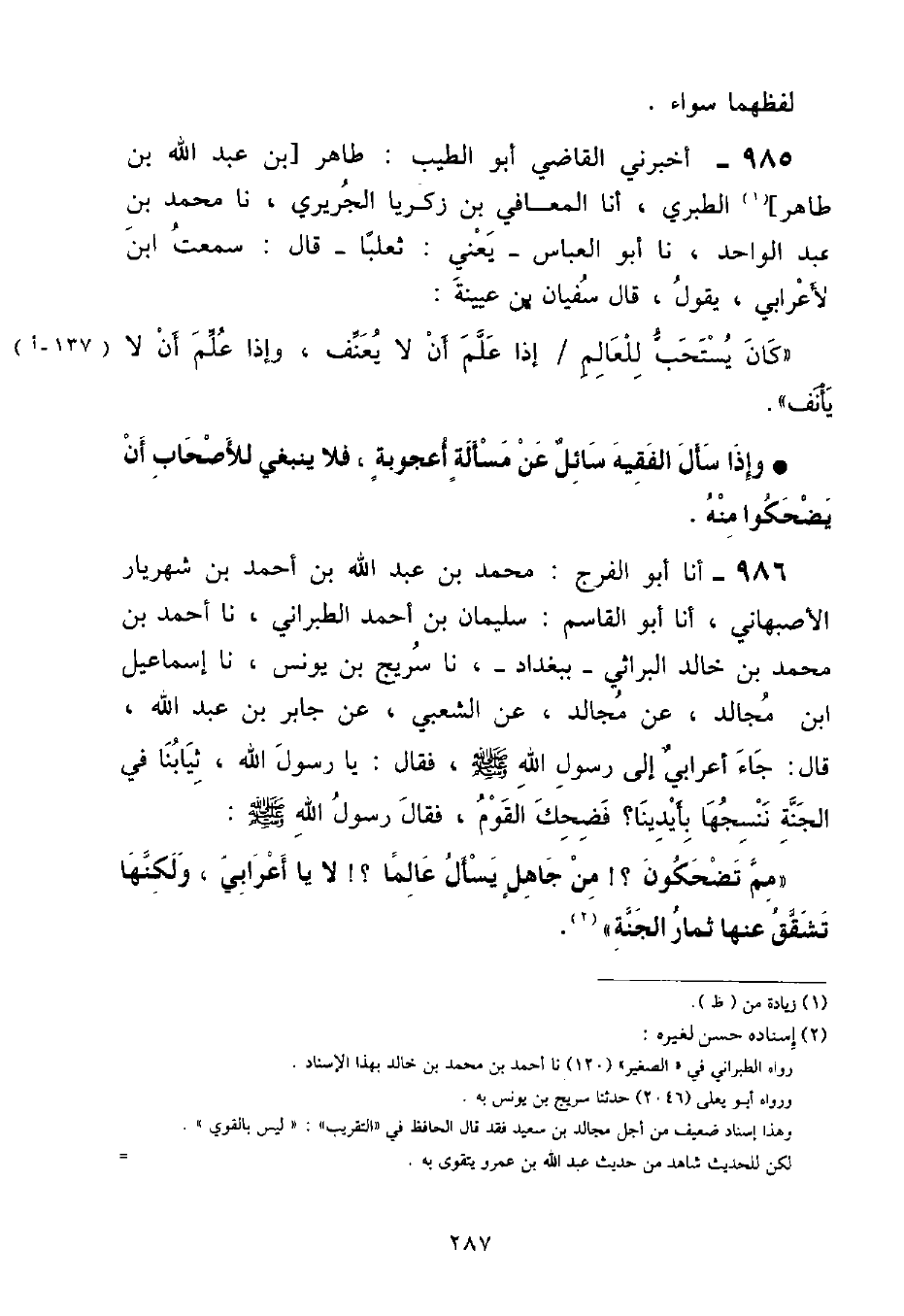 وَإِذَا سَأَلَ الْفَقِيهَ سَائِلٌ عَنْ مَسْأَلَةٍ أُعْجُوبَةٍ , فَلَا يَنْبَغِي لِلْأَصْحَابِ أَنْ يَضْحَكُوا مِنْهُ أنا أَبُو الْفَرَجِ مُحَمَّدُ بْنُ عَبْدِ اللَّهِ بْنِ أَحْمَدَ بْنِ شَهْرَيَارَ الْأَصْبَهَانِيُّ , أنا أَبُو الْقَاسِمِ سُلَيْمَانُ بْنُ أَحْمَدَ الطَّبَرَانِيُّ , نا أَحْمَدُ بْنُ مُحَمَّدِ بْنِ خَالِدٍ الرَّاثِيُّ , بِبَغْدَادَ , نا سُرَيْجُ بْنُ يُونُسَ , نا إِسْمَاعِيلُ بْنُ مُجَالِدٍ , عَنْ مُجَالِدٍ , عَنِ الشَّعْبِيِّ , عَنْ جَابِرِ بْنِ عَبْدِ اللَّهِ , قَالَ: جَاءَ أَعْرَابِيٌّ إِلَى رَسُولِ اللَّهِ صَلَّى اللهُ عَلَيْهِ وَسَلَّمَ , فَقَالَ: يَا رَسُولَ اللَّهِ , ثِيَابُنَا فِي الْجَنَّةِ نَنْسِجُهَا بِأَيْدِينَا؟ فَضَحِكَ الْقَوْمُ , فَقَالَ رَسُولُ اللَّهِ صَلَّى اللهُ عَلَيْهِ وَسَلَّمَ: «مِمَّ تَضْحَكُونَ؟ مِنْ جَاهِلٍ يَسْأَلُ عَالِمًا؟ لَا يَا أَعْرَابِيُّ , وَلَكِنَّهَا تَشَقَّقُ عَنْهَا ثِمَارُ الْجَنَّةِ» ⦗٢٨٨⦘ وَيَنْبَغِي لِلْمُتَعَلِّمِينَ أَلَا يَرُدُّوا عَلَى مَنْ أَخْطَأَ بِحَضْرَةِ الْعَالِمِ , وَيَتْرُكُوا الْعَالِمَ حَتَّى يَكُونَ هُوَ الَّذِي يَرُدُّ عَلَيْهِ