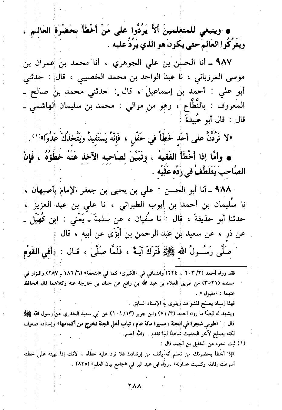 وَأَمَّا إِذَا أَخْطَأَ الْفَقِيهُ , وَتَبَيَّنَ لِصَاحِبِهِ الْآخِذِ عَنْهُ خَطَؤُهُ , فَإِنَّ الصَّاحِبَ يَتَلَطَّفُ فِي رَدِّهِ عَلَيْهِ أنا أَبُو الْحَسَنِ عَلِيُّ بْنُ يَحْيَى بْنِ جَعْفَرٍ الْإِمَامُ بِأَصْبَهَانَ , نا سُلَيْمَانُ بْنُ أَحْمَدَ بْنِ أَيُّوبَ الطَّبَرَانِيُّ , نا عَلِيُّ بْنُ عَبْدِ الْعَزِيزِ , حَدَّثَنَا أَبُو حُذَيْفَةَ , قَالَ: نا سُفْيَانُ , عَنْ سَلَمَةَ يَعْنِي ابْنَ كُهَيْلٍ , عَنْ ذَرٍّ , عَنْ سَعِيدِ بْنِ عَبْدِ الرَّحْمَنِ بْنِ أَبْزَى , عَنْ أَبِيهِ , قَالَ: صَلَّى رَسُولُ اللَّهِ صَلَّى اللهُ عَلَيْهِ وَسَلَّمَ فَتَرَكَ آيَةً , فَلَمَّا صَلَّى , قَالَ: «أَفِي الْقَوْمِ ⦗٢٨٩⦘ أُبَيُّ بْنُ كَعْبٍ؟» فَقَالَ: يَا رَسُولَ اللَّهِ , نُسِخَتْ آيَةُ كَذَا وَكَذَا , أَمْ نُسِّيتَهَا , قَالَ: «بَلْ نُسِّيتُهَا»