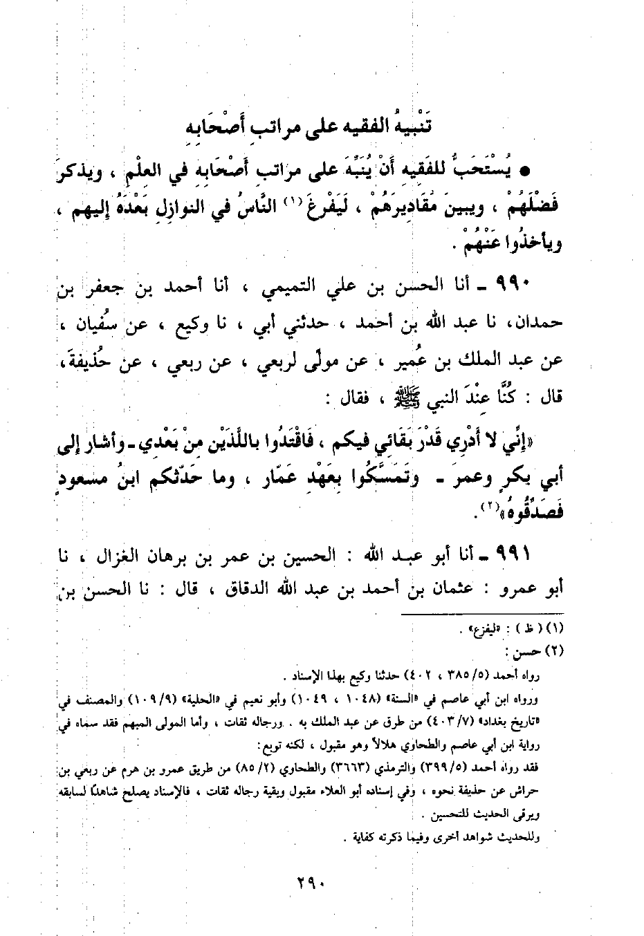يُسْتَحَبُّ لِلْفَقِيهِ أَنْ يُنَبِّهَ عَلَى مَرَاتِبِ أَصْحَابِهِ فِي الْعِلْمِ , وَيَذْكُرَ فَضْلَهُمْ , وَيُبَيِّنَ مَقَادِيرَهُمْ , لِيَفْرُغَ النَّاسُ فِي النَّوَازِلِ بَعْدَهُ إِلَيْهِمْ , وَيَأْخُذُوا عَنْهُمْ أنا الْحَسَنُ بْنُ عَلِيٍّ التَّمِيمِيُّ , أنا أَحْمَدُ بْنُ جَعْفَرِ بْنِ حَمْدَانَ , نا عَبْدُ اللَّهِ بْنُ أَحْمَدَ , حَدَّثَنِي أَبِي , نا وَكِيعٌ , عَنْ سُفْيَانَ , عَنْ عَبْدِ الْمَلِكِ بْنِ عُمَيْرٍ , عَنْ مَوْلًى لِرِبْعِيٍّ , عَنْ رِبْعِيٍّ , عَنْ حُذَيْفَةَ , قَالَ: كُنَّا عِنْدَ النَّبِيِّ صَلَّى اللهُ عَلَيْهِ وَسَلَّمَ , فَقَالَ: «إِنِّي لَا أَدْرِي قَدْرَ بَقَائِي فِيكُمْ , فَاقْتُدُوا بِاللَّذَيْنِ مِنْ بَعْدِي وَأَشَارَ إِلَى أَبِي بَكْرٍ وَعُمَرَ وَتَمَسَّكُوا بِعَهْدِ عَمَّارٍ , وَمَا حَدَّثَكُمُ ابْنُ مَسْعُودٍ فَصَدِّقُوهُ»