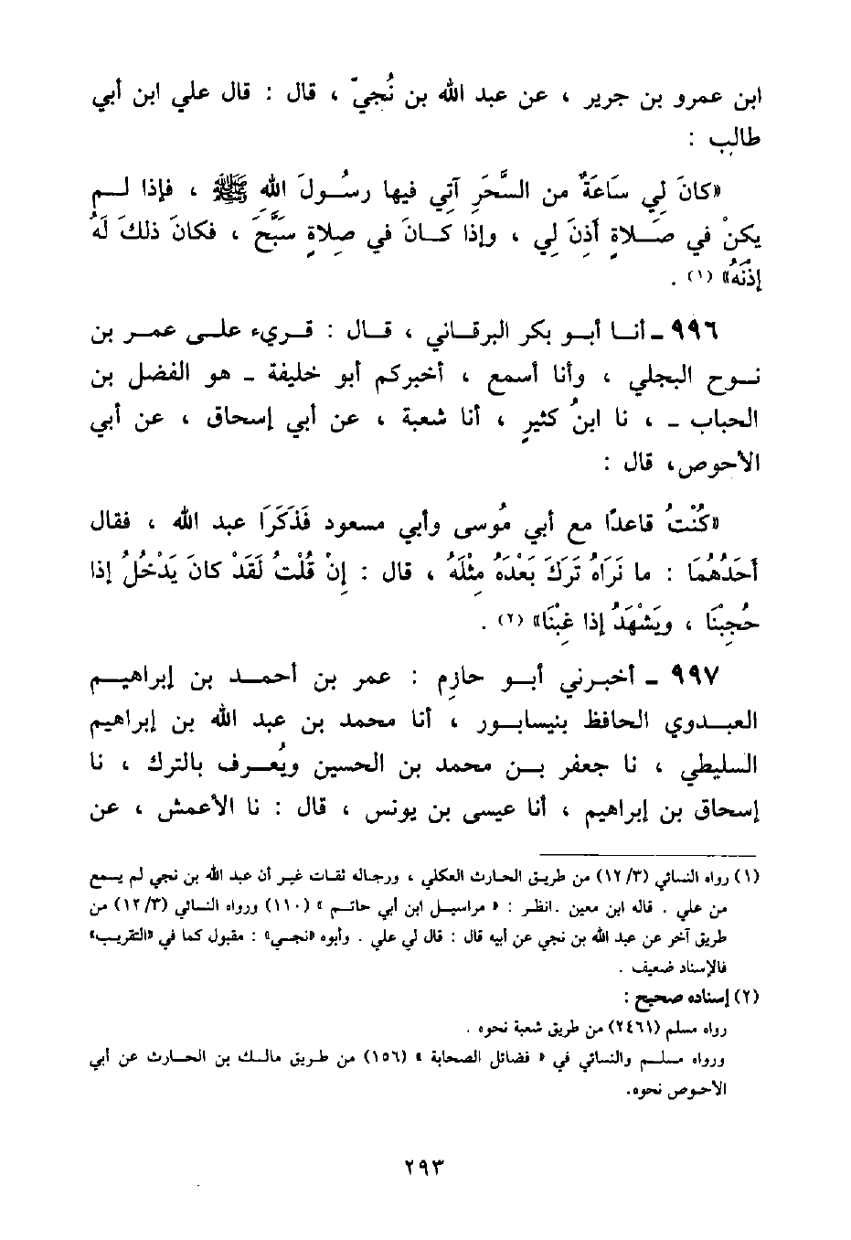 أنا أَبُو بَكْرٍ الْبُرْقَانِيُّ , قَالَ: قُرِئَ عَلَى عُمَرَ بْنِ نُوحٍ الْبَجَلِيُّ , وأنا أَسْمَعُ , أَخْبَرَكُمْ أَبُو خَلِيفَةَ هُوَ الْفَضْلُ بْنُ الْحُبَابِ , نا ابْنُ كَثِيرٍ , أنا شُعْبَةُ , عَنْ أَبِي إِسْحَاقَ , عَنْ أَبِي الْأَحْوَصِ , قَالَ: كُنْتُ قَاعِدًا مَعَ أَبِي مُوسَى وَأَبِي مَسْعُودٍ فَذَكَرَا عَبْدَ اللَّهِ , فَقَالَ أَحَدُهُمَا: «مَا نَرَاهُ تَرَكَ بَعْدَهُ مِثْلَهُ» , قَالَ: «إِنْ قُلْتَ ذَاكَ، لَقَدْ كَانَ يَدْخُلُ إِذَا حُجِبْنَا , وَيَشْهَدُ إِذَا غِبْنَا»