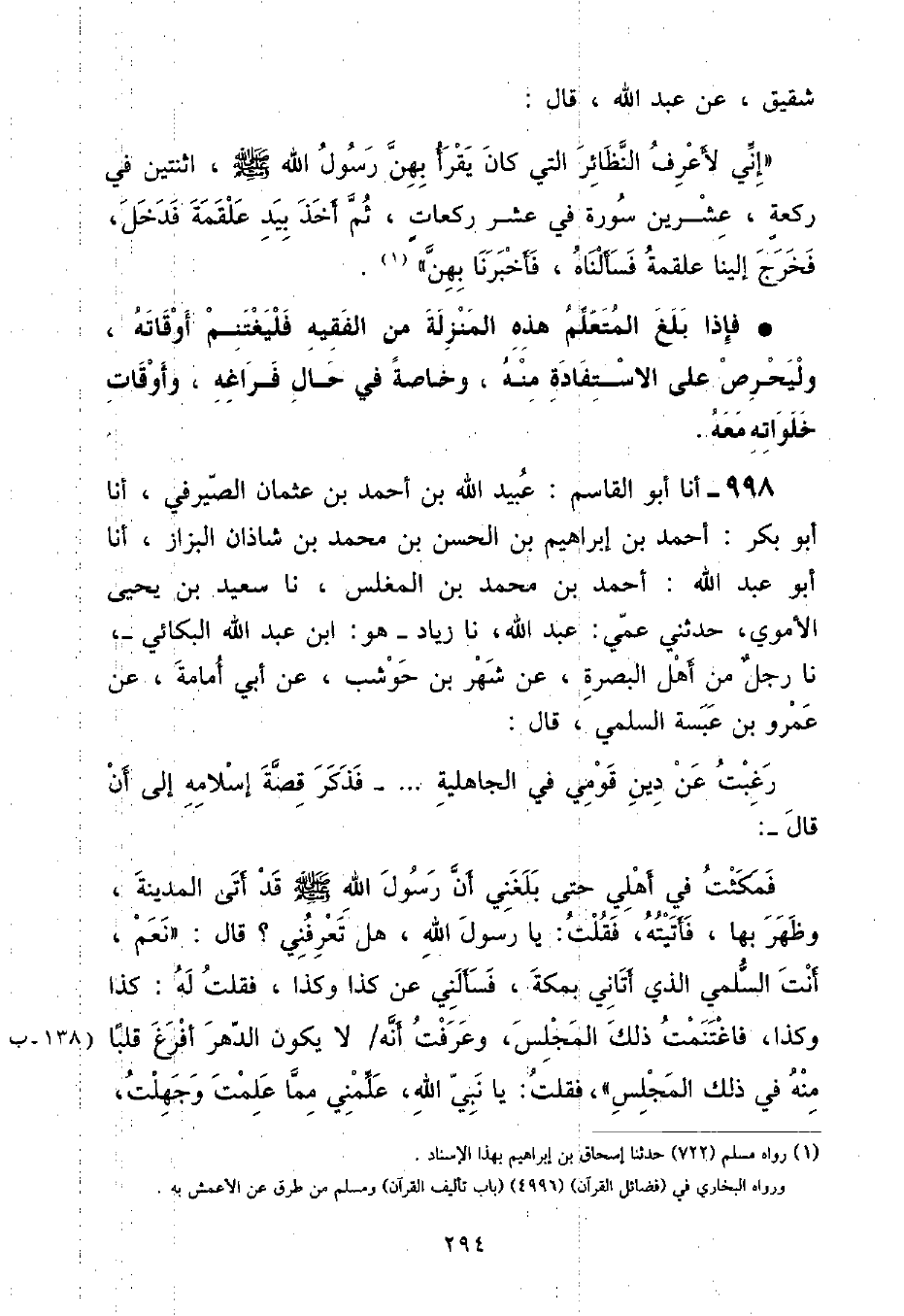 فَإِذَا بَلَغَ الْمُتَعَلِّمُ هَذِهِ الْمَنْزِلَةَ مِنَ الْفَقِيهِ فَلْيَغْتَنِمْ أَوْقَاتَهُ , وَلْيَحْرِصْ عَلَى الِاسْتِفَادَةِ مِنْهُ , وَخَاصَّةً فِي حَالِ فَرَاغِهِ , وَأَوْقَاتِ خَلَوَاتِهِ مَعَهُ. أنا أَبُو الْقَاسِمِ عُبَيْدُ اللَّهِ بْنُ أَحْمَدَ بْنِ عُثْمَانَ الصَّيْرَفِيُّ , أنا أَبُو بَكْرٍ أَحْمَدُ بْنُ إِبْرَاهِيمَ بْنِ الْحَسَنِ بْنِ مُحَمَّدِ بْنِ شَاذَانَ الْبَزَّازُ , أنا أَبُو عَبْدِ اللَّهِ أَحْمَدُ بْنُ مُحَمَّدِ بْنِ الْمُغَلِّسِ , نا سَعِيدُ بْنُ يَحْيَى الْأُمَوِيُّ , حَدَّثَنِي عَمِّي عَبْدُ اللَّهِ , نا زِيَادٌ هُوَ ابْنُ عَبْدِ اللَّهِ الْبَكَّائِيُّ , نا رَجُلٌ مِنْ أَهْلِ الْبَصْرَةِ , عَنْ شَهْرِ بْنِ حَوْشَبٍ , عَنْ أَبِي أُمَامَةَ , عَنْ عَمْرِو بْنِ عَبَسَةَ السُّلَمِيِّ , قَالَ: رَغِبْتُ عَنْ دِينِ , قَوْمِي فِي الْجَاهِلِيَّةِ فَذَكَرَ قِصَّةَ إِسْلَامِهِ إِلَى أَنْ قَالَ: فَمَكَثْتُ فِي أَهْلِي حَتَّى بَلَغَنِي أَنَّ رَسُولَ اللَّهِ صَلَّى اللهُ عَلَيْهِ وَسَلَّمَ قَدْ أَتَى الْمَدِينَةَ , وَظَهَرَ بِهَا , فَأَتَيْتُهُ , فَقُلْتُ: يَا رَسُولَ اللَّهِ , هَلْ تَعْرِفُنِي؟ قَالَ: «نَعَمْ , أَنْتَ السُّلَمِيُّ الَّذِي أَتَانِي بِمَكَّةَ» , فَسَأَلَنِي عَنْ كَذَا كَذَا , فَقُلْتُ لَهُ: كَذَا وَكَذَا , فَاغْتَنَمْتُ ذَلِكَ الْمَجْلِسَ , وَعَرَفْتُ أَنَّهُ لَا يَكُونُ الدَّهْرُ أَفْرَغَ قَلْبًا مِنْهُ فِي ذَلِكَ الْمَجْلِسِ , فَقُلْتُ: يَا نَبِيَّ اللَّهِ، عَلِّمْنِي مِمَّا عَلِمْتَ وَجَهِلْتُ ⦗٢٩٥⦘، وَمَا يَنْفَعُنِي وَلَا يَضُرُّكَ "
