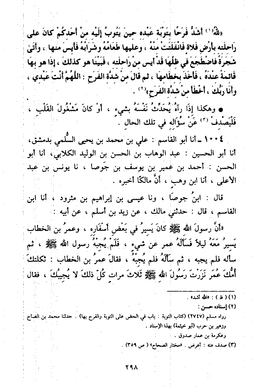 أنا أَبُو الْقَاسِمِ: عَلِيُّ بْنُ مُحَمَّدِ بْنِ يَحْيَى السُّلَمِيُّ بِدِمَشْقَ , أنا أَبُو الْحُسَيْنِ: عَبْدُ الْوَهَّابِ بْنُ الْحَسَنِ بْنِ الْوَلِيدِ الْكِلَابِيُّ , أنا أَبُو الْحَسَنِ أَحْمَدُ بْنُ عُمَيْرِ بْنِ يُوسُفَ بْنِ جُوصَا , نا يُونُسُ بْنُ عَبْدِ الْأَعْلَى , أنا ابْنُ وَهْبٍ , أَنَّ مَالِكًا , أَخْبَرَهُ. قَالَ ابْنُ جُوصَا: ونا عِيسَى بْنُ إِبْرَاهِيمَ بْنِ مَثْرُودٍ , أنا ابْنُ الْقَاسِمِ , قَالَ: حَدَّثَنِي مَالِكٌ , عَنْ زَيْدِ بْنِ أَسْلَمَ , عَنْ أَبِيهِ: أَنَّ رَسُولَ اللَّهِ صَلَّى اللهُ عَلَيْهِ وَسَلَّمَ كَانَ يَسِيرُ فِي بَعْضِ أَسْفَارِهِ , وَعُمَرُ بْنُ الْخَطَّابِ يَسِيرُ مَعَهُ لَيْلًا فَسَأَلَهُ عُمَرُ عَنْ شَيْءٍ , فَلَمْ يُجِبْهُ رَسُولُ اللَّهِ صَلَّى اللهُ عَلَيْهِ وَسَلَّمَ , ثُمَّ سَأَلَهُ فَلَمْ يُجِبْهُ , ثُمَّ سَأَلَهُ فَلَمْ يُجِبْهُ , فَقَالَ عُمَرُ بْنُ الْخَطَّابِ: ثَكِلَتْكَ أُمُّكَ عُمَرُ نَزَرْتَ رَسُولَ اللَّهِ صَلَّى اللهُ عَلَيْهِ وَسَلَّمَ ثَلَاثَ مَرَّاتٍ كُلُّ ذَلِكَ لَا يُجِيبُكَ , فَقَالَ ⦗٢٩٩⦘ عُمَرُ: فَحَرَّكْتُ بَعِيرِي حَتَّى تَقَدَّمْتُ أَمَامَ النَّاسِ , فَمَا نَشِبْتُ أَنْ سَمِعْتُ صَارِخًا يَصْرُخُ , فَقُلْتُ: لَقَدْ خَشِيتُ أَنْ يَنْزِلَ فِيَّ قُرْآنٌ , فَجِئْتُ رَسُولَ اللَّهِ صَلَّى اللهُ عَلَيْهِ وَسَلَّمَ , فَسَلَّمْتُ عَلَيْهِ , فَقَالَ: " لَقَدْ نَزَلَتْ عَلَيَّ اللَّيْلَةَ سُورَةٌ لَهِيَ أَحَبُّ إِلَيَّ مِمَّا طَلَعَتْ عَلَيْهِ الشَّمْسُ , ثُمَّ قَرَأَ: إِنَّا فَتَحْنَا لَكَ فَتْحًا مُبِينًا "