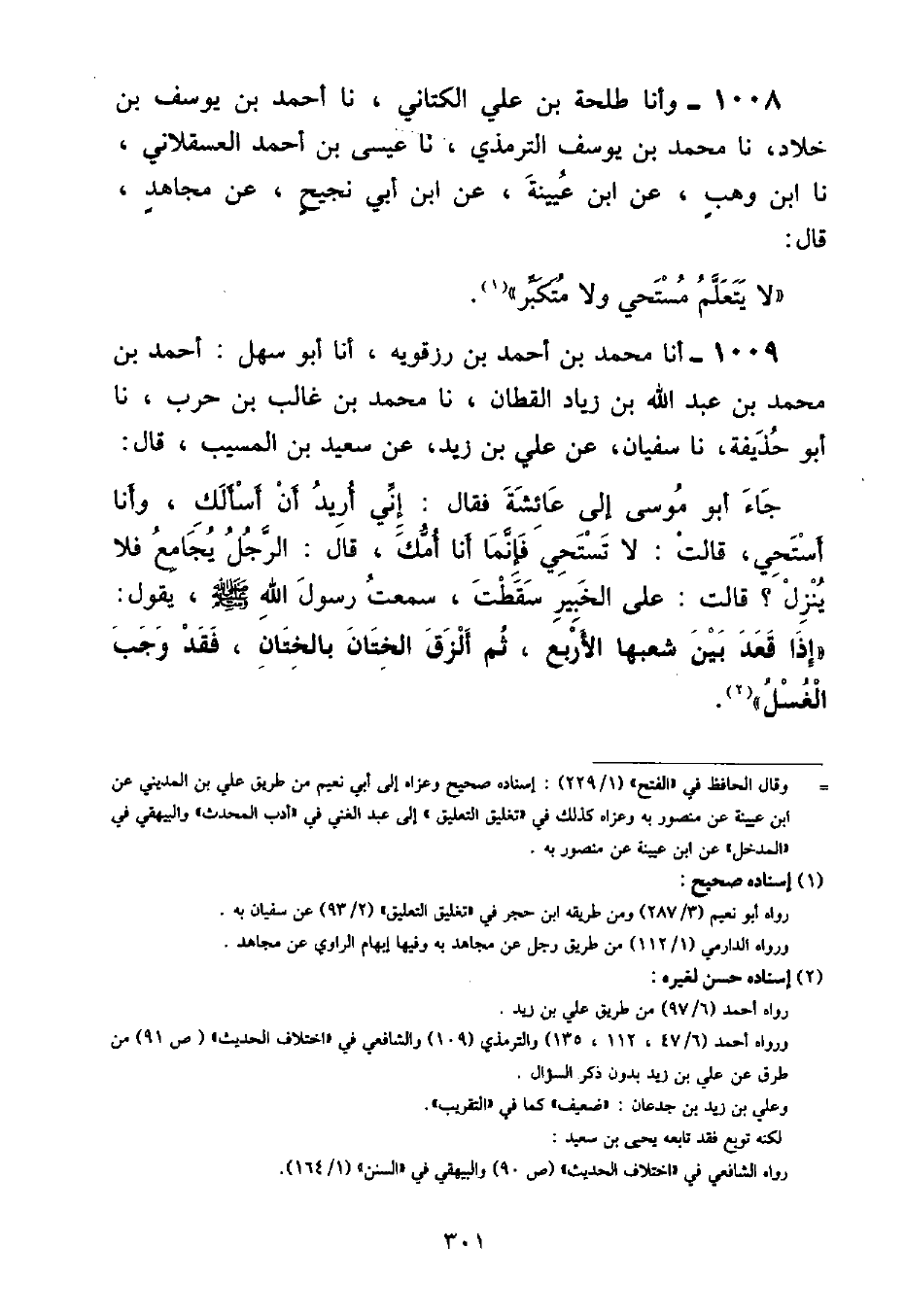 وأنا طَلْحَةُ بْنُ عَلِيٍّ الْكَتَّانِيُّ , نا أَحْمَدُ بْنُ يُوسُفَ بْنِ خَلَّادٍ , نا مُحَمَّدُ بْنُ يُوسُفَ التِّرْمِذِيُّ , نا عِيسَى بْنُ أَحْمَدَ الْعَسْقَلَانِيُّ , نا ابْنُ وَهْبٍ , عَنِ ابْنِ عُيَيْنَةَ , عَنِ ابْنِ أَبِي نَجِيحٍ , عَنْ مُجَاهِدٍ , قَالَ: «لَا يَتَعَلَّمُ مُسْتَحْيٍ وَلَا مُتَكَبِّرٌ»