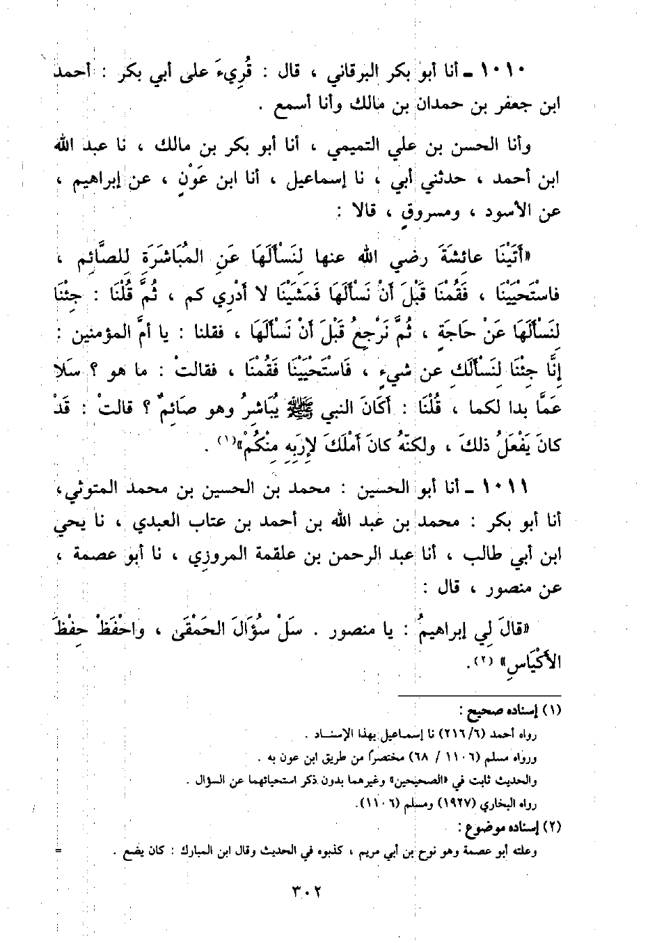 أنا أَبُو بَكْرٍ الْبُرْقَانِيُّ , قَالَ: قُرِئَ عَلَى أَبِي بَكْرٍ أَحْمَدَ بْنِ جَعْفَرِ بْنِ حَمْدَانَ بْنَ مَالِكٍ وَأَنَا أَسْمَعُ , وأنا الْحَسَنُ بْنُ عَلِيٍّ التَّمِيمِيُّ , أنا أَبُو بَكْرِ بْنُ مَالِكٍ , نا عَبْدُ اللَّهِ بْنُ أَحْمَدَ , حَدَّثَنِي أَبِي , نا إِسْمَاعِيلُ , أنا ابْنُ عَوْنٍ , عَنْ إِبْرَاهِيمَ , عَنِ الْأَسْوَدِ , ومَسْرُوقٍ , قَالَا: أَتَيْنَا عَائِشَةَ رَضِيَ اللَّهُ عَنْهَا لِنَسْأَلَهَا عَنِ الْمُبَاشَرَةِ لِلصَّائِمِ , فَاسْتَحْيَيْنَا , فَقُمْنَا قَبْلَ أَنْ نَسْأَلَهَا فَمَشَيْنَا لَا أَدْرِي كَمْ , ثُمَّ قُلْنَا: جِئْنَا لِنَسْأَلَهَا عَنْ حَاجَةٍ , ثُمَّ نَرْجِعُ قَبْلَ أَنْ نَسْأَلَهَا , فَقُلْنَا: يَا أُمَّ الْمُؤْمِنِينَ: إِنَّا جِئْنَا لِنَسْأَلَكِ عَنْ شَيْءٍ , فَاسْتَحْيَيْنَا فَقُمْنَا , فَقَالَتْ: مَا هُوَ؟ سَلَا عَمَّا بَدَا لَكُمَا , قُلْنَا: أَكَانَ النَّبِيُّ صَلَّى اللهُ عَلَيْهِ وَسَلَّمَ يُبَاشِرُ وَهُوَ صَائِمٌ؟ قَالَتْ: «قَدْ كَانَ يَفْعَلُ ذَلِكَ , وَلَكِنَّهُ كَانَ أَمْلَكَ لِإِرَبِهِ مِنْكُمْ»