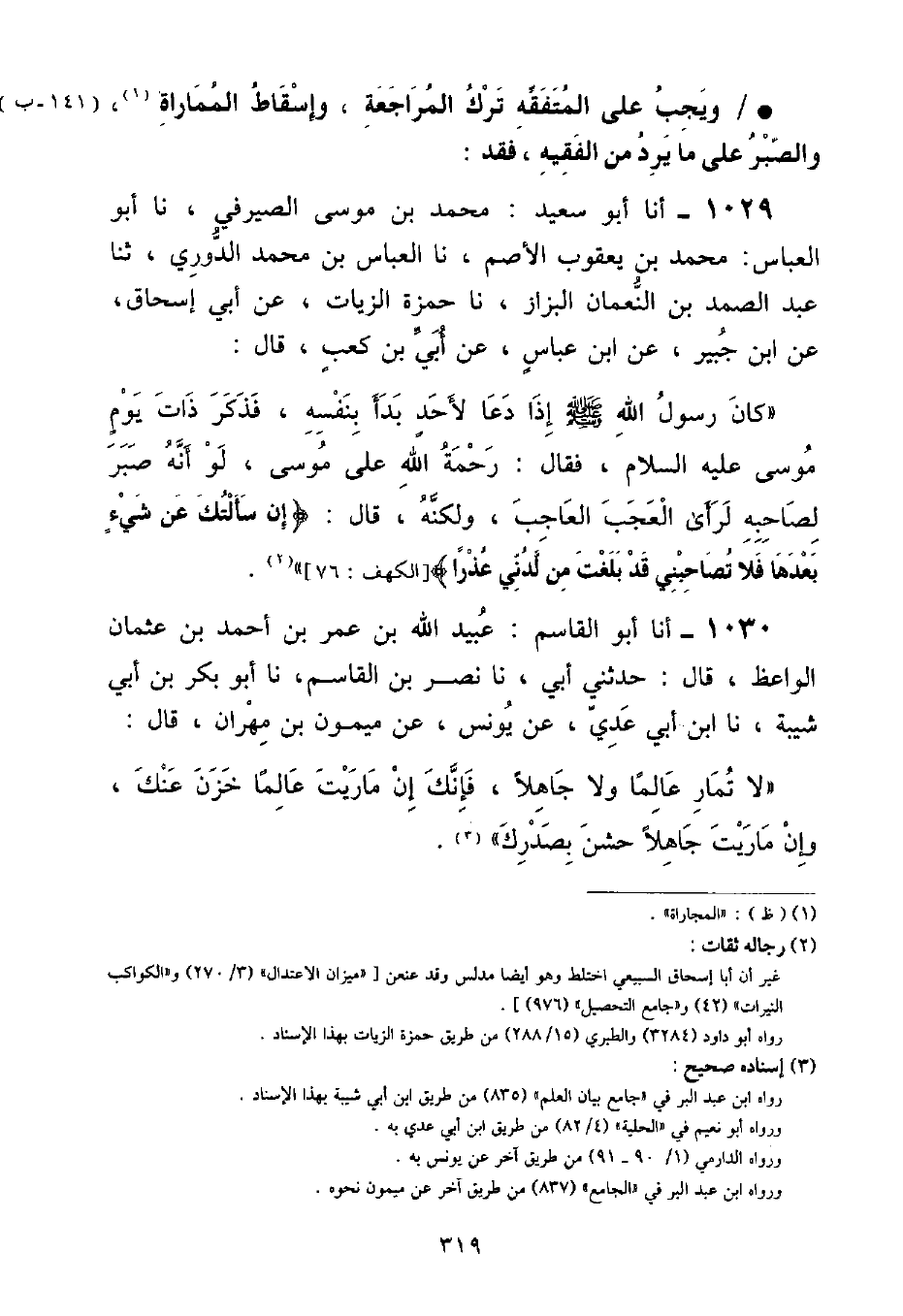 وَيَجِبُ عَلَى الْمُتَفَقِّهِ تَرْكُ الْمُرَاجَعَةِ , وَإِسْقَاطُ الْمُمَارَاةِ وَالصَّبْرُ عَلَى مَا يَرِدُ مِنَ الْفَقِيهِ , فَقَدْ: أنا أَبُو سَعِيدٍ مُحَمَّدُ بْنُ مُوسَى الصَّيْرَفِيُّ , نا أَبُو الْعَبَّاسِ مُحَمَّدُ بْنُ يَعْقُوبَ الْأَصَمُّ , نا الْعَبَّاسُ بْنُ مُحَمَّدٍ الدُّورِيُّ , نا عَبْدُ الصَّمَدِ بْنُ النُّعْمَانِ الْبَزَّازُ , نا حَمْزَةُ الزَّيَّاتُ , عَنْ أَبِي إِسْحَاقَ , عَنِ ابْنِ جُبَيْرٍ , عَنِ ابْنِ عَبَّاسٍ , عَنْ أُبَيِّ بْنِ كَعْبٍ , قَالَ: كَانَ رَسُولُ اللَّهِ صَلَّى اللهُ عَلَيْهِ وَسَلَّمَ إِذَا دَعَا لِأَحَدٍ بَدَأَ بِنَفْسِهِ , فَذَكَرَ ذَاتَ يَوْمٍ مُوسَى عَلَيْهِ السَّلَامُ , فَقَالَ: " رَحْمَةُ اللَّهِ عَلَى مُوسَى , لَوْ أَنَّهُ صَبَرَ لِصَاحِبِهِ لَرَأَى الْعَجَبَ الْعَاجِبَ , وَلَكِنَّهُ , قَالَ: {إِنْ سَأَلْتُكَ عَنْ شَيْءٍ بَعْدَهَا فَلَا تُصَاحِبْنِي قَدْ بَلَغْتَ مِنْ لَدُنِّي عُذْرًا} [الكهف: ٧٦] "