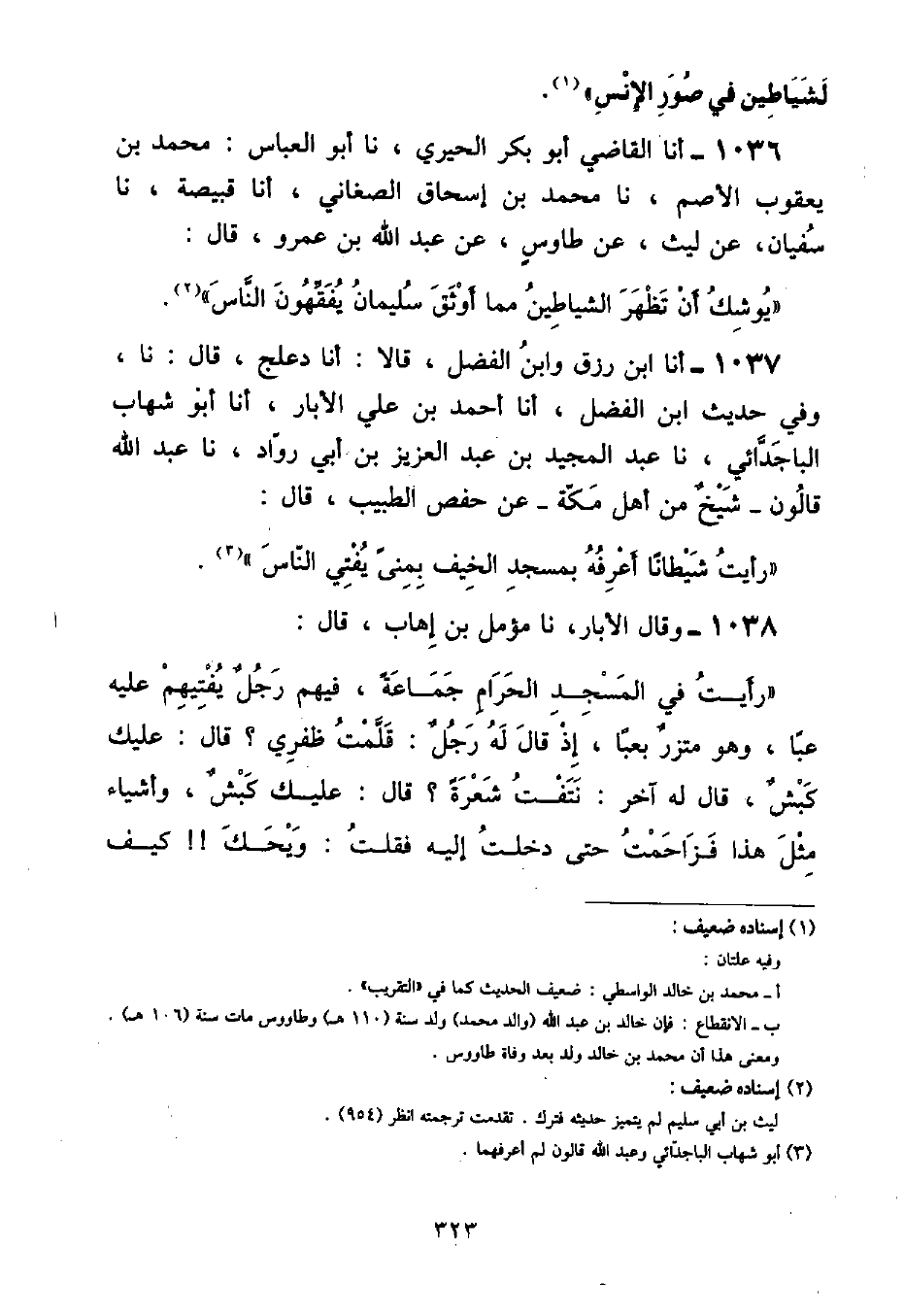 أنا ابْنُ رِزْقٍ , وَابْنُ الْفَضْلِ , قَالَا: أنا دَعْلَجُ , قَالَ: نا , وَفِي حَدِيثِ ابْنِ الْفَضْلِ , أنا أَحْمَدُ بْنُ عَلِيٍّ الْأَبَّارُ , أنا أَبُو شِهَابٍ الْبَاجَدَّائِيُّ , نا عَبْدُ الْمَجِيدِ بْنُ عَبْدِ الْعَزِيزِ بْنِ أَبِي رَوَّادٍ , نا عَبْدُ اللَّهِ قَالُونُ شَيْخٌ مِنْ أَهْلِ مَكَّةَ، عَنْ حَفْصٍ الطَّبِيبِ , قَالَ: «رَأَيْتُ شَيْطَانًا أَعْرِفُهُ بِمَسْجِدِ الْخِيفِ بِمِنًى يُفْتِي النَّاسَ»