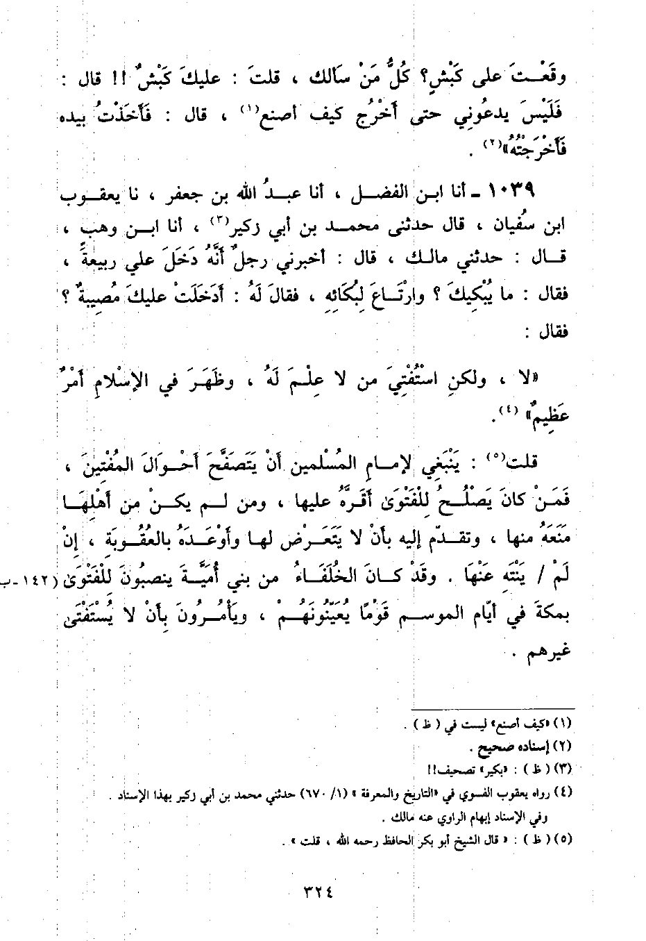 أنا ابْنُ الْفَضْلِ , أنا عَبْدُ اللَّهِ بْنُ جَعْفَرٍ , نا يَعْقُوبُ بْنُ سُفْيَانَ , قَالَ حَدَّثَنِي مُحَمَّدُ بْنُ أَبِي زُكَيْرٍ , أنا ابْنُ وَهْبٍ , قَالَ: حَدَّثَنِي مَالِكٌ , قَالَ: أَخْبَرَنِي رَجُلٌ , أَنَّهُ دَخَلَ عَلَى رَبِيعَةَ , فَقَالَ: مَا يُبْكِيكَ وَارْتَاعَ لِبُكَائِهِ , فَقَالَ لَهُ: أَدَخَلَتْ عَلَيْكَ مُصِيبَةٌ؟ فَقَالَ: لَا , وَلَكِنِ «اسْتُفْتِيَ مَنْ لَا عِلْمَ لَهُ , وَظَهَرَ فِي الْإِسْلَامِ أَمْرٌ عَظِيمٌ» قُلْتُ: يَنْبَغِي لِإِمَامِ الْمُسْلِمِينَ أَنْ يَتَصَفَّحَ أَحْوَالَ الْمُفْتِينَ , فَمَنْ كَانَ يَصْلُحُ لِلْفَتْوَى أَقَرَّهُ عَلَيْهَا , وَمَنْ لَمْ يَكُنْ مِنْ أَهْلِهَا مَنَعَهُ مِنْهَا , وَتَقَدَّمَ إِلَيْهِ بِأَنْ لَا يَتَعَرَّضَ لَهَا وَأَوْعَدَهُ بِالْعُقُوبَةِ , إِنْ لَمْ يَنْتَهِ عَنْهَا وَقَدْ كَانَ الْخُلَفَاءُ مِنْ بَنِي أُمَيَّةَ يُنَصِّبُونَ لِلْفَتْوَى بِمَكَّةَ فِي أَيَّامِ الْمَوْسِمِ قَوْمًا يُعِينُونَهُمْ , وَيَأْمُرُونَ بِأَنْ لَا يُسْتَفْتَى غَيْرُهُمْ