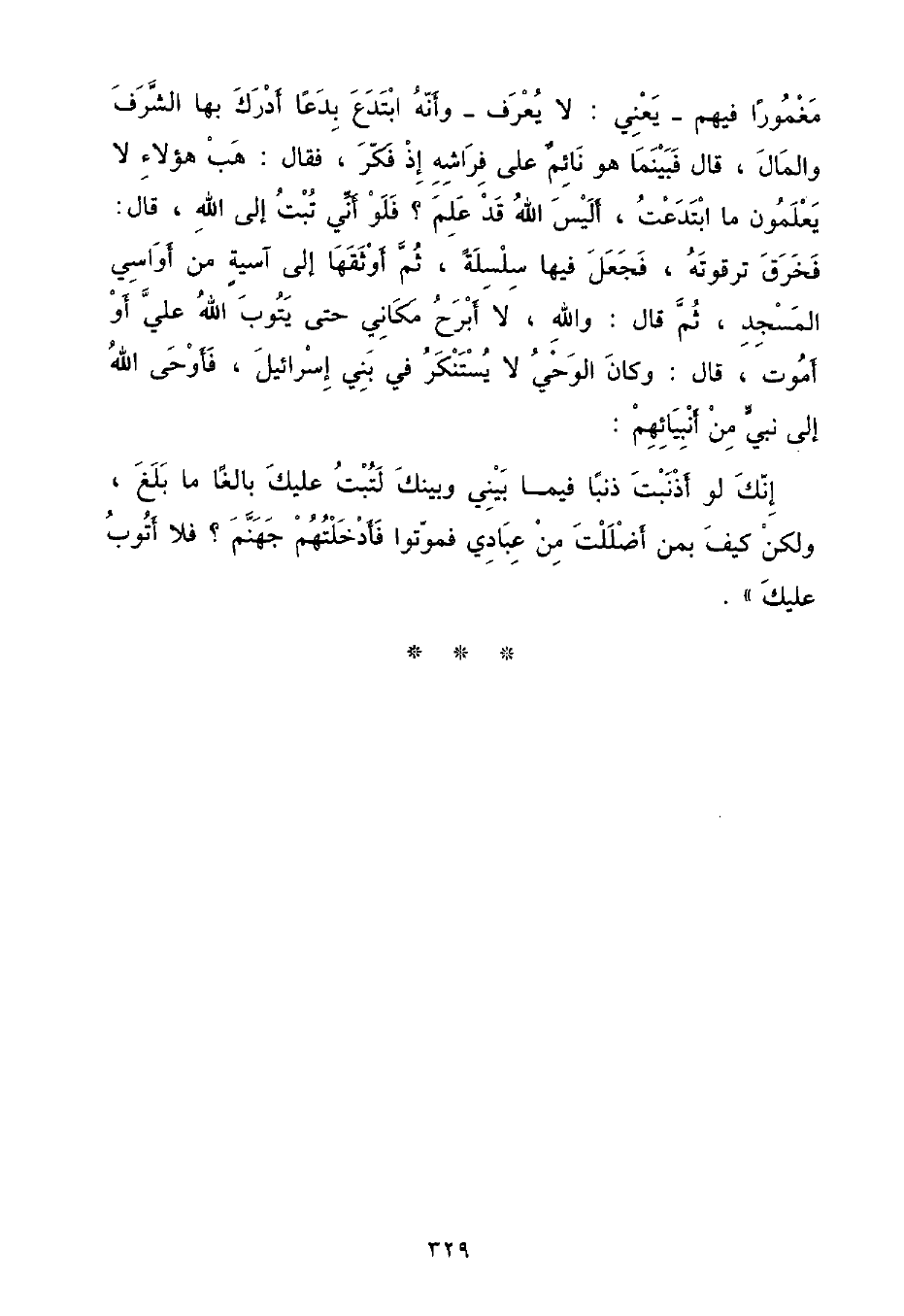 مَغْمُورًا فِيهِمْ يَعْنِي: لَا يُعْرَفُ وَأَنَّهُ ابْتَدَعَ بِدَعًا أَدْرَكَ بِهَا الشَّرَفَ وَالْمَالَ , قَالَ: فَبَيْنَمَا هُوَ نَائِمٌ عَلَى فِرَاشِهِ إِذْ فَكَّرَ , فَقَالَ: هَبْ هَؤُلَاءِ لَا يَعْلَمُونَ مَا ابْتَدَعْتُ , أَلَيْسَ اللَّهُ قَدْ عَلِمَ؟ فَلَوْ أَنِّي تُبْتُ إِلَى اللَّهِ , قَالَ: فَخَرَقَ تَرْقُوَتَهُ , فَجَعَلَ فِيهَا سِلْسِلَةً , ثُمَّ أَوْثَقَهَا إِلَى آسِيَةٍ مِنْ أَوَاسِي الْمَسْجِدِ , ثُمَّ قَالَ: وَاللَّهِ , لَا أَبْرَحُ مَكَانِي حَتَّى يَتُوبَ اللَّهُ عَلَيَّ أَوْ أَمُوتَ , قَالَ: وَكَانَ الْوَحْيُ لَا يُسْتَنْكَرُ فِي بَنِي إِسْرَائِيلَ , فَأَوْحَى اللَّهُ إِلَى نَبِيٍّ مِنْ أَنْبِيَائِهِمْ: إِنَّكَ لَوْ أَذْنَبْتَ ذَنْبًا فِيمَا بَيْنِي وَبَيْنَكَ لَتُبْتُ عَلَيْكَ بَالِغًا مَا بَلَغَ , وَلَكِنْ كَيْفَ بِمَنْ أَضْلَلْتَ مِنْ عِبَادِي فَمَوَّتُوا فَأَدْخَلْتُهُمْ جَهَنَّمَ؟ فَلَا أَتُوبُ عَلَيْكَ "
