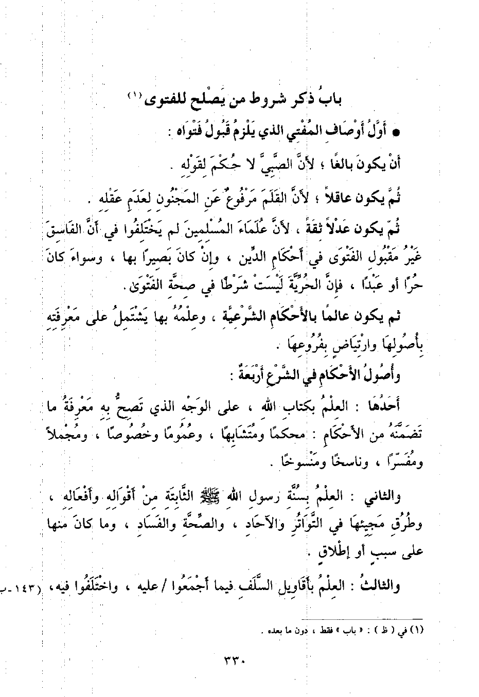 بَابُ ذِكْرِ شُرُوطِ مَنْ يَصْلُحُ لِلْفَتْوَى أَوَّلُ أَوْصَافِ الْمُفْتِي الَّذِي يَلْزَمُ قَبُولُ فَتْوَاهُ: أَنْ يَكُونَ بَالِغًا , لِأَنَّ الصَّبِيَّ لَا حُكْمَ لِقَوْلِهِ ثُمَّ يَكُونُ عاقلاً لِأَنَّ القَلَمَ مَرْفُوعٌ عَنِ المَجْنُونِ لِعَدَمِ عَقْلِهِ ثُمَّ يَكُونُ عَدْلًا ثِقَةً , لِأَنَّ الْقَلَمَ مَرْفُوعٌ عَنِ الْمَجْنُونِ لِعَدَمِ عَقْلِهِ ثُمَّ يَكُونُ عَدْلًا ثِقَةً , لِأَنَّ عُلَمَاءَ الْمُسْلِمِينَ لَمْ يَخْتَلِفُوا فِي أَنَّ الْفَاسِقَ غَيْرُ مَقْبُولِ الْفَتْوَى فِي أَحْكَامِ الدِّينِ , وَإِنْ كَانَ بَصِيرًا بِهَا , وَسَوَاءً كَانَ حُرًّا أَوْ عَبْدًا , فَإِنَّ الْحُرِّيَّةَ لَيْسَتْ شَرْطًا فِي صِحَّةِ الْفَتْوَى ثُمَّ يَكُونُ عَالِمًا بِالْأَحْكَامِ الشَّرْعِيَّةِ , وَعِلْمُهُ بِهَا يَشْتَمِلُ عَلَى مَعْرِفَتِهِ بِأُصُولِهَا وَارْتِيَاضٍ بِفُرُوعِهَا وَأُصُولُ الْأَحْكَامِ فِي الشَّرْعِ أَرْبَعَةٌ: أَحَدُهَا: الْعِلْمُ بِكِتَابِ اللَّهِ , عَلَى الْوَجْهِ الَّذِي تَصِحُّ بِهِ مَعْرِفَةُ مَا تَضَمَّنَهُ مِنَ الْأَحْكَامِ: مُحْكَمًا وَمُتَشَابِهًا , وَعُمُومًا وَخُصُوصًا , وَمُجْمَلًا وَمُفَسَّرًا , وَنَاسِخًا وَمَنْسُوخًا وَالثَّانِي: الْعِلْمُ بِسُنَّةِ رَسُولِ اللَّهِ صَلَّى اللهُ عَلَيْهِ وَسَلَّمَ الثَّابِتَةِ مِنْ أَقْوَالِهِ وَأَفْعَالِهِ , وَطُرُقِ مَجِيئِهَا فِي التَّوَاتُرِ وَالْآحَادِ , وَالصِّحَّةِ وَالْفَسَادِ , وَمَا كَانَ مِنْهَا عَلَى سَبَبٍ أَوْ إِطْلَاقٍ وَالثَّالِثُ: الْعِلْمُ بِأَقَاوِيلِ السَّلَفِ فِيمَا أَجْمَعُوا عَلَيْهِ , وَاخْتَلَفُوا فِيهِ ,