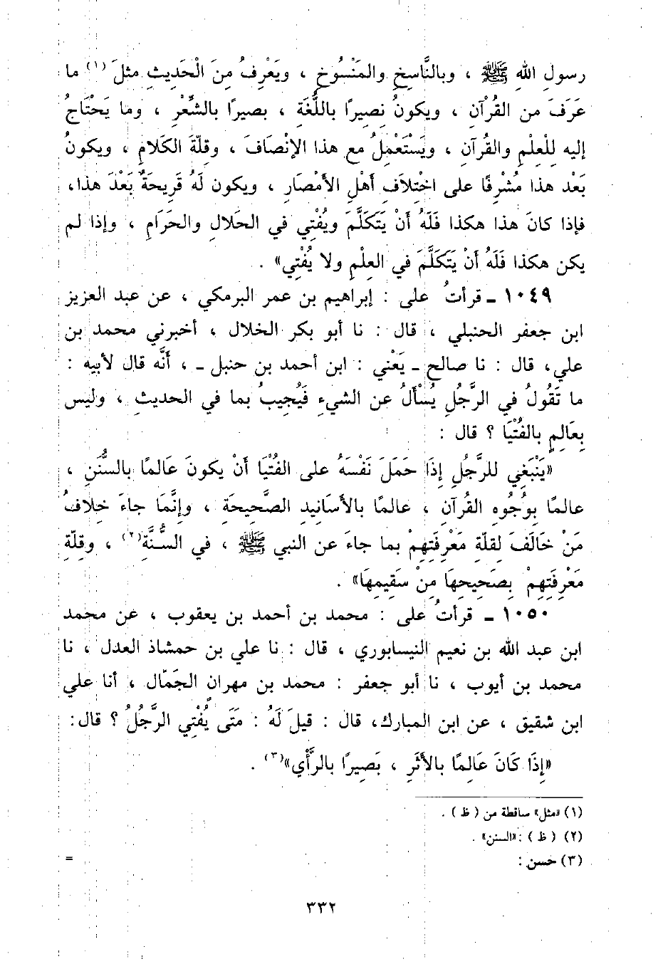 قَرَأْتُ عَلَى إِبْرَاهِيمَ بْنِ عُمَرَ الْبَرْمَكِيِّ , عَنْ عَبْدِ الْعَزِيزِ بْنِ جَعْفَرٍ الْحَنْبَلِيِّ , قَالَ: نا أَبُو بَكْرٍ الْخَلَّالُ , أَخْبَرَنِي مُحَمَّدُ بْنُ عَلِيٍّ , قَالَ: نا صَالِحٌ يَعْنِي ابْنَ أَحْمَدَ بْنِ حَنْبَلٍ , أَنَّهُ قَالَ لِأَبِيهِ: مَا تَقُولُ فِي الرَّجُلِ يَسْأَلُ عَنِ الشَّيْءِ فَيُجِيبُ بِمَا فِي الْحَدِيثِ , وَلَيْسَ بِعَالِمٍ بِالْفُتْيَا؟ قَالَ: «يَنْبَغِي لِلرَّجُلِ إِذَا حَمَلَ نَفْسَهُ عَلَى الْفُتْيَا أَنْ يَكُونَ عَالِمًا بِالسُّنَنِ , عَالِمًا بِوُجُوهِ الْقُرْآنِ , عَالِمًا بِالْأَسَانِيدِ الصَّحِيحَةِ , وَإِنَّمَا جَاءَ خِلَافُ مَنْ خَالَفَ لِقِلَّةِ مَعْرِفَتِهِمْ بِمَا جَاءَ عَنِ النَّبِيِّ صَلَّى اللهُ عَلَيْهِ وَسَلَّمَ فِي السُّنَّةِ , وَقِلَّةِ مَعْرِفَتِهِمْ بِصَحِيحِهَا مِنْ سَقِيمِهَا»