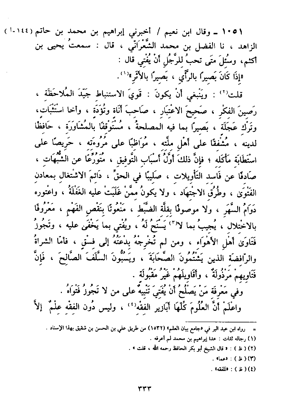 وَقَالَ ابْنُ نُعَيْمٍ أَخْبَرَنِي إِبْرَاهِيمُ بْنُ مُحَمَّدِ بْنِ حَاتِمٍ الزَّاهِدُ , نا الْفَضْلُ بْنُ مُحَمَّدٍ الشَّعْرَانِيُّ , قَالَ: سَمِعْتُ يَحْيَى بْنَ أَكْثَمَ , وَسُئِلَ , مَتَى تُحِبُّ لِلرَّجُلِ أَنْ يُفْتِيَ قَالَ: «إِذَا كَانَ بَصِيرًا بِالرَّأْيِ , بَصِيرًا بِالْأَثَرِ» قُلْتُ: وَيَنْبَغِي أَنْ يَكُونَ: قَوِيَّ الِاسْتِنْبَاطِ جَيِّدَ الْمُلَاحَظَةِ , رَصِينَ الْفِكْرِ , صَحِيحَ الِاعْتِبَارِ , صَاحِبَ أَنَاةٍ وَتُؤَدَةٍ , وَأَخًا اسْتَثْبَاتٍ , وَتَرْكِ عَجَلَةٍ , بَصِيرًا بِمَا فِيهِ الْمَصْلَحَةٌ , مَسْتَوْقِفًا بِالْمُشَاوَرَةِ , حَافِظًا لِدِينِهِ , مُشْفِقًا عَلَى أَهْلِ مِلَّتِهِ , مُوَاظِبًا عَلَى مُرُوءَتِهِ , حَرِيصًا عَلَى اسْتِطَابَةِ مَأْكَلِهِ , فَإِنَّ ذَلِكَ أَوَّلُ أَسْبَابِ التَّوْفِيقِ , مُتَوَرِّعًا عَنِ الشُّبُهَاتِ , صَادِفًا عَنْ فَاسِدِ التَّأْوِيلَاتِ , صَلِيبًا فِي الْحَقِّ , دَائِمُ الِاشْتِغَالِ بِمَعَادِنِ الْفَتْوَى , وَطُرُقِ الِاجْتِهَادِ , وَلَا يَكُونُ مِمَّنْ غَلَبَتْ عَلَيْهِ الْغَفْلَةُ , وَاعْتَوَرَهُ دَوَامُ السَّهَرِ , وَلَا مَوْصُوفًا بِقِلَّةِ الضَّبْطِ , مَنْعُوتًا بِنَقْصِ الْفَهْمِ , مَعْرُوفًا بِالِاخْتِلَالِ , يُجِيبُ بِمَا لَا يَسْنَحُ لَهُ , وَيُفْتِي بِمَا يَخْفَى عَلَيْهِ , وَتَجُوزُ فَتَاوَى أَهْلِ الْأَهْوَاءِ , وَمَنْ لَمْ تُخْرِجْهُ بِدْعَتُهُ إِلَى فِسْقٍ , فَأَمَّا الشُّرَاةُ وَالرَّافِضَةُ الَّذِينَ يَشْتِمُونَ الصَّحَابَةَ , وَيَسُبُّونَ السَّلَفَ الصَّالِحَ , فَإِنَّ فَتَاوِيهُمْ مَرْذُولَةٌ , وَأَقَاوِيلُهُمْ غَيْرُ مَقْبُولَةٍ وَفِي مَعْرِفَةِ مَنْ يَصْلُحُ أَنْ يُفْتِيَ تَنْبِيهٌ عَلَى مَنْ لَا تَجُوزُ فَتْوَاهُ وَاعْلَمْ أَنَّ الْعُلُومَ كُلَّهَا أَبَازِيرُ الْفِقْهِ , وَلَيْسَ دُونَ الْفِقْهِ عِلْمٌ إِلَّا