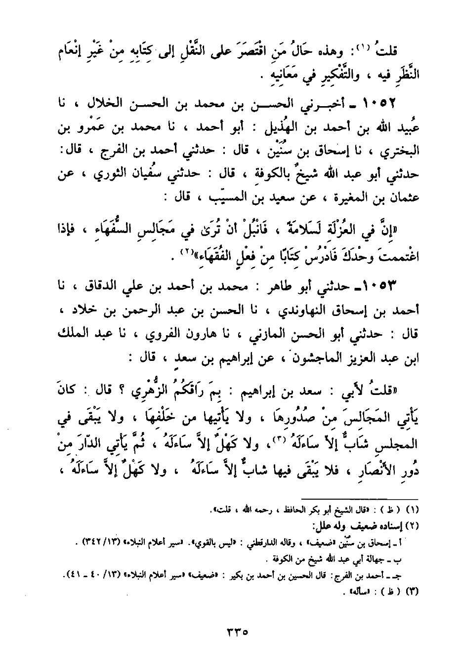 أَخْبَرَنِي الْحَسَنُ بْنُ مُحَمَّدِ بْنِ الْحَسَنِ الْخَلَّالُ , نا عُبَيْدُ اللَّهِ بْنُ أَحْمَدَ بْنِ الْهُذَيْلِ أَبُو أَحْمَدَ , نا مُحَمَّدُ بْنُ عَمْرِو بْنِ الْبَخْتَرِيِّ , نا إِسْحَاقُ بْنُ سِنِينَ , قَالَ: حَدَّثَنِي أَحْمَدُ بْنُ الْفَرَجِ , قَالَ: حَدَّثَنِي أَبُو عَبْدِ اللَّهِ , شَيْخٌ بِالْكُوفَةِ , قَالَ: حَدَّثَنِي سُفْيَانُ الثَّوْرِيُّ , عَنْ عُثْمَانَ بْنِ الْمُغِيرَةِ , عَنْ سَعِيدِ بْنِ الْمُسَيِّبِ , قَالَ: «إِنَّ فِي الْعُزْلَةِ لَسَلَامَةً , فَانْبُلْ أَنْ تَرَى فِي مَجَالِسِ السُّفَهَاءِ , فَإِذَا اغْتَمَمْتَ وَحْدَكَ فَادْرُسْ كِتَابًا مِنْ فِعْلِ الْفُقَهَاءِ»