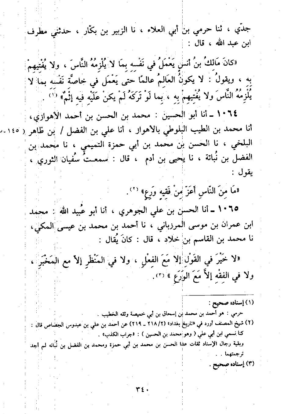 أنا أَبُو الْحُسَيْنِ مُحَمَّدُ بْنُ الْحَسَنِ بْنِ أَحْمَدَ الْأَهْوَازِيُّ , أنا مُحَمَّدُ بْنُ الطَّيِّبِ الْبَلُّوطِيُّ , بِالْأَهْوَازِ , أنا عَلِيُّ بْنُ الْفَضْلِ بْنِ طَاهِرٍ الْبَلْخِيُّ , نا الْحَسَنُ بْنُ مُحَمَّدِ بْنِ أَبِي حَمْزَةَ التَّمِيمِيُّ , نا مُحَمَّدُ بْنُ الْفَضْلِ بْنِ نُبَاتَةَ , نا يَحْيَى بْنُ آدَمَ , قَالَ: سَمِعْتُ سُفْيَانَ الثَّوْرِيَّ , يَقُولُ: «مَا مِنَ النَّاسِ أَعَزُّ مِنْ فَقِيهٍ وَرَعٍ»