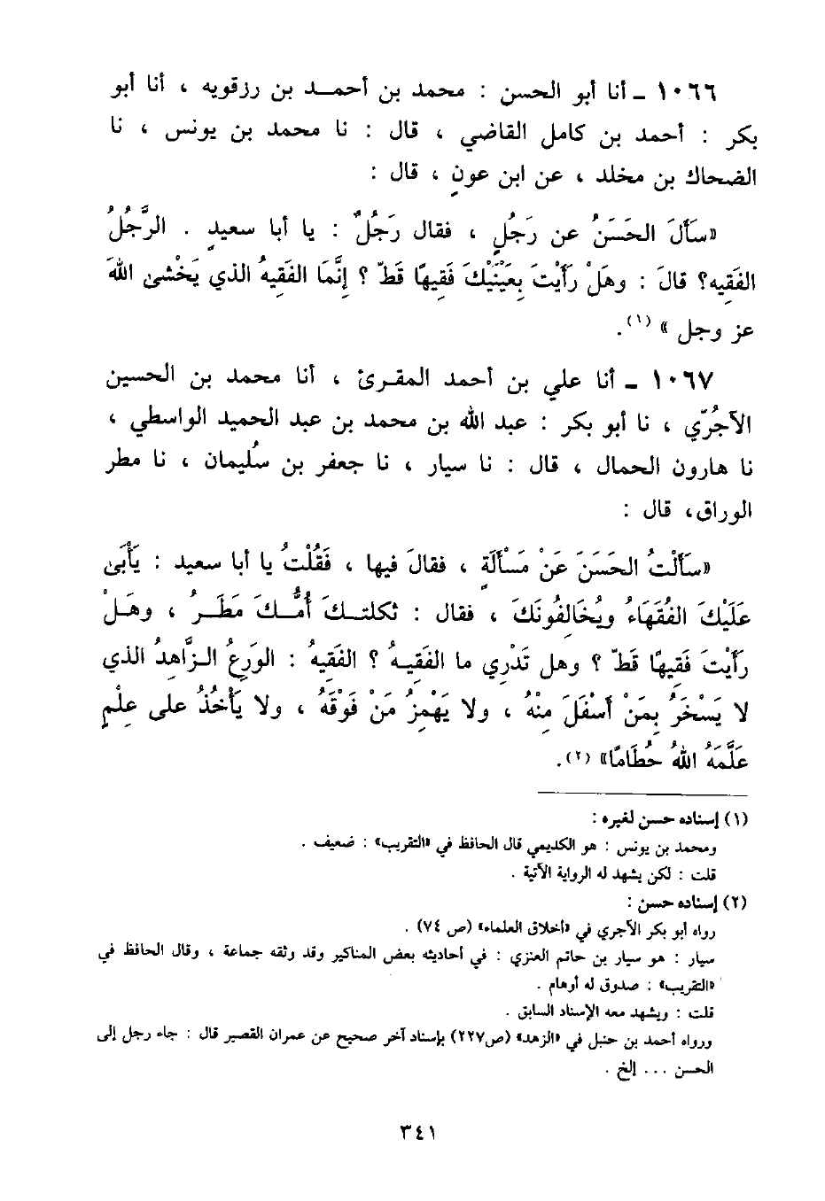 أنا أَبُو الْحَسَنِ: مُحَمَّدُ بْنُ أَحْمَدَ بْنِ رِزْقَوَيْهِ , أنا أَبُو بَكْرٍ أَحْمَدُ بْنُ كَامِلٍ الْقَاضِي , قَالَ: نا مُحَمَّدُ بْنُ يُونُسَ , نا الضَّحَّاكُ بْنُ مَخْلَدٍ , عَنِ ابْنِ عَوْنٍ , قَالَ: سَأَلَ الْحَسَنُ عَنْ رَجُلٍ , فَقَالَ رَجُلٌ: يَا أَبَا سَعِيدٍ الرَّجُلُ الْفَقِيهُ؟ قَالَ: «وَهَلْ رَأَيْتَ بِعَيْنَيْكَ فَقِيهًا قَطُّ؟ إِنَّمَا الْفَقِيهُ الَّذِي يَخْشَى اللَّهَ عَزَّ وَجَلَّ»