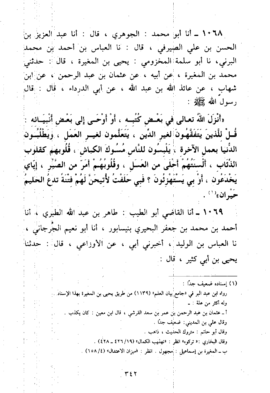 أنا أَبُو مُحَمَّدٍ الْجَوْهَرِيُّ قَالَ: أنا عَبْدُ الْعَزِيزِ بْنُ الْحَسَنِ بْنِ عَلِيٍّ الصَّيْرَفِيُّ , قَالَ: نا الْعَبَّاسُ بْنُ أَحْمَدَ بْنِ مُحَمَّدٍ الْبَرْنِيُّ , نا أَبُو سَلَمَةَ الْمَخْزُومِيُّ يَحْيَى بْنُ الْمُغِيرَةِ , قَالَ: حَدَّثَنِي مُحَمَّدُ بْنُ الْمُغِيرَةِ , عَنْ أَبِيهِ , عَنْ عُثْمَانَ بْنِ عَبْدِ الرَّحْمَنِ , عَنِ ابْنِ شِهَابٍ , عَنْ عَائِذِ اللَّهِ بْنِ عَبْدِ اللَّهِ , عَنْ أَبِي الدَّرْدَاءِ , قَالَ: قَالَ رَسُولُ اللَّهِ صَلَّى اللهُ عَلَيْهِ وَسَلَّمَ: أَنْزَلَ اللَّهُ تَعَالَى فِي بَعْضِ كُتُبِهِ , أَوْ أَوْحَى إِلَى بَعْضِ أَنْبِيَائِهِ: «قُلْ لِلَّذِينَ يَتَفَقَّهُونَ لِغَيْرِ الدِّينِ , يَتَعَلَّمُونَ لِغَيْرِ الْعَمَلِ , وَيَطْلُبُونَ الدُّنْيَا بِعَمَلِ الْآخِرَةِ , يَلْبَسُونَ لِلنَّاسِ مُسُوكَ الْكِبَاشِ , قُلُوبُهُمْ كَقُلُوبِ الذِّئَابِ , أَلْسِنَتُهُمْ أَحْلَى مِنَ الْعَسَلِ , وَقُلُوبُهُمْ أَمَرُّ مِنَ الصَّبْرِ , إِيَّايَ يَخْدَعُونَ , أَوْ بِي يَسْتَهْزِئُونَ؟ فَبِي حَلَفْتُ لَأُتِيحَنَّ لَهُمْ فِتْنَةً تَدَعْ الْحَلِيمَ حَيْرَانَ»