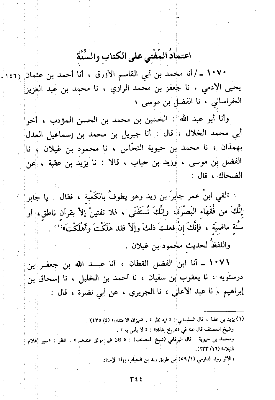 أنا مُحَمَّدُ بْنُ أَبِي الْقَاسِمِ الْأَزْرَقُ , أنا أَحْمَدُ بْنُ عُثْمَانَ يَحْيَى الْآدَمِيُّ , نا جَعْفَرُ بْنُ مُحَمَّدٍ الرَّازِيُّ , نا مُحَمَّدُ بْنُ عَبْدِ الْعَزِيزِ الْخُرَاسَانِيُّ , نا الْفَضْلُ بْنُ مُوسَى , وأنا أَبُو عَبْدِ اللَّهِ الْحُسَيْنُ بْنُ مُحَمَّدِ بْنِ الْحَسَنِ الْمُؤَدِّبُ أَخُو أَبِي مُحَمَّدٍ الْخَلَّالِ , قَالَ: أنا جِبْرِيلُ بْنُ مُحَمَّدِ بْنِ إِسْمَاعِيلَ الْعَدْلُ , بِهَمَذَانَ , نا مُحَمَّدُ بْنُ حَيَوَيْهِ النَّحَّاسُ , نا مَحْمُودُ بْنُ غَيْلَانَ , نا الْفَضْلُ بْنُ مُوسَى , وَزَيْدُ بْنُ حُبَابٍ , قَالَا: نا يَزِيدُ بْنُ عُقْبَةَ , عَنِ الضَّحَّاكِ , قَالَ: لَقِيَ ابْنُ عُمَرَ جَابِرَ بْنَ زَيْدٍ وَهُوَ يَطُوفُ بِالْكَعْبَةِ , فَقَالَ: «يَا جَابِرُ إِنَّكَ مِنْ فُقَهَاءِ الْبَصْرَةِ , وَإِنَّكَ تُسْتَفْتَى , فَلَا تُفْتِيَنَّ إِلَّا بِقُرْآنٍ نَاطِقٍ , أَوْ سُنَّةٍ مَاضِيَةٍ , فَإِنَّكَ إِنْ فَعَلْتَ ذَلِكَ , وَإِلَّا فَقَدْ هَلَكْتَ وَأَهْلَكْتَ» وَاللَّفْظُ لِحَدِيثِ مَحْمُودِ بْنِ غَيْلَانَ