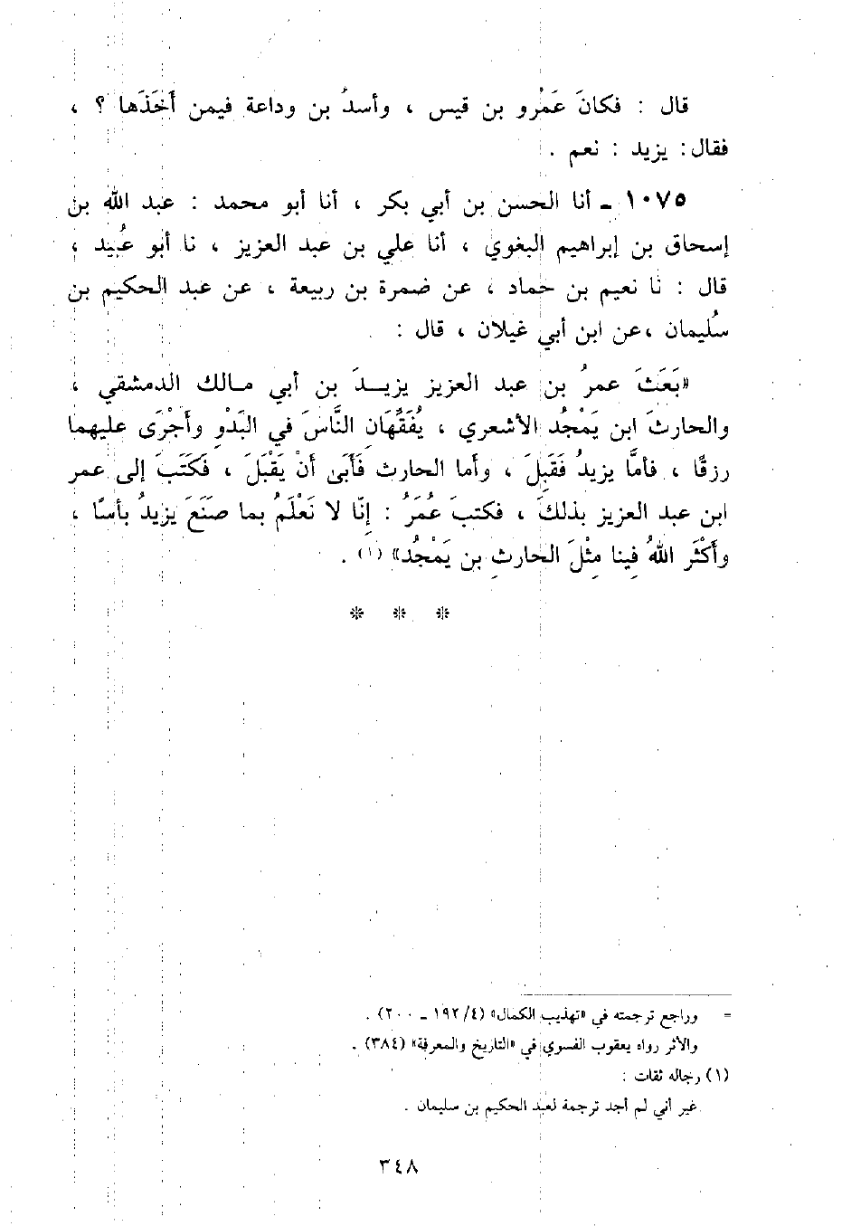 أنا الْحَسَنُ بْنُ أَبِي بَكْرٍ , أنا أَبُو مُحَمَّدٍ عَبْدُ اللَّهِ بْنُ إِسْحَاقَ بْنِ إِبْرَاهِيمَ الْبَغَوِيُّ , أنا عَلِيُّ بْنُ عَبْدِ الْعَزِيزِ , نا أَبُو عُبَيْدٍ , قَالَ: نا نُعَيْمُ بْنُ حَمَّادٍ , عَنْ ضَمْرَةَ بْنِ رَبِيعَةَ , عَنْ عَبْدِ الْحَكِيمِ بْنِ سُلَيْمَانَ , عَنِ ابْنِ أَبِي غَيْلَانَ , قَالَ: " بَعَثَ عُمَرُ بْنُ عَبْدِ الْعَزِيزِ يَزِيدَ بْنَ أَبِي مَالِكٍ الدِّمَشْقِيَّ , وَالْحَارِثَ بْنَ يَمْجُدَ الْأَشْعَرِيَّ , يُفَقِّهَانِ النَّاسَ فِي الْبَدْوِ وَأَجْرَى عَلَيْهِمَا رِزْقًا , فَأَمَّا يَزِيدُ فَقَبِلَ , وَأَمَّا الْحَارِثُ فَأَبَى أَنْ يَقْبَلَ , فَكَتَبَ إِلَى عُمَرَ بْنِ عَبْدِ الْعَزِيزِ بِذَلِكَ , فَكَتَبَ عُمَرُ: إِنَّا لَا نَعْلَمُ بِمَا صَنَعَ يَزِيدُ بَأْسًا , وَأَكْثَرَ اللَّهُ فِينَا مِثْلَ الْحَارِثِ بْنِ يَمْجُدَ "
