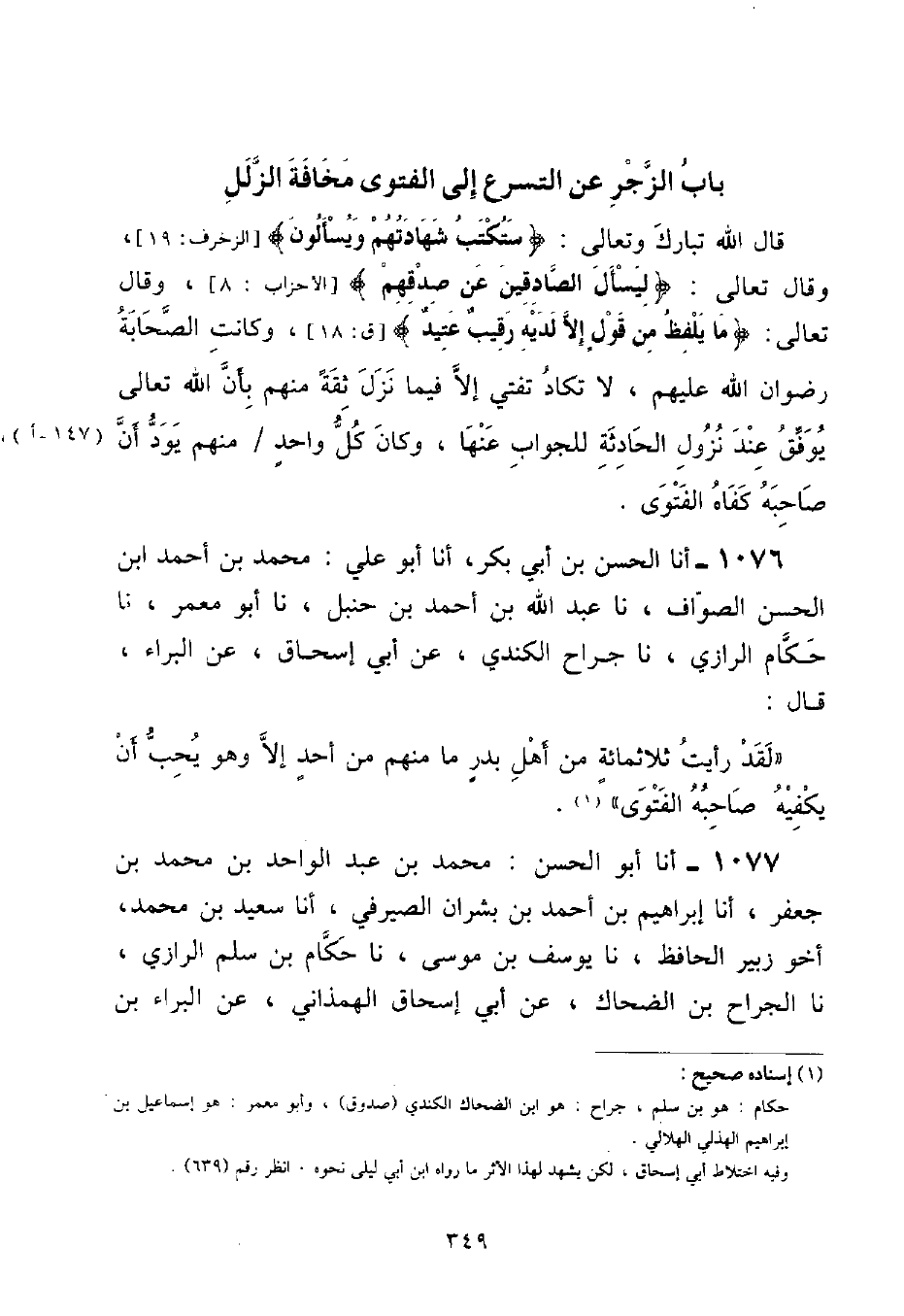 أنا الْحَسَنُ بْنُ أَبِي بَكْرٍ , أنا أَبُو عَلِيٍّ مُحَمَّدُ بْنُ أَحْمَدَ بْنِ الْحَسَنِ الصَّوَّافُ , نا عَبْدُ اللَّهِ بْنُ أَحْمَدَ بْنِ حَنْبَلٍ , نا أَبُو مَعْمَرٍ , نا حَكَّامُ الرَّازِيُّ , نا جِرَاحٌ الْكِنْدِيُّ , عَنْ أَبِي إِسْحَاقَ , عَنِ الْبَرَاءِ , قَالَ: «لَقَدْ رَأَيْتُ ثَلَاثَمِائَةٍ مِنْ أَهْلِ بَدْرٍ مَا مِنْهُمْ مِنْ أَحَدٍ إِلَّا وَهُوَ يُحِبُّ أَنْ يَكْفِيَهُ صَاحِبُهُ الْفَتْوَى»