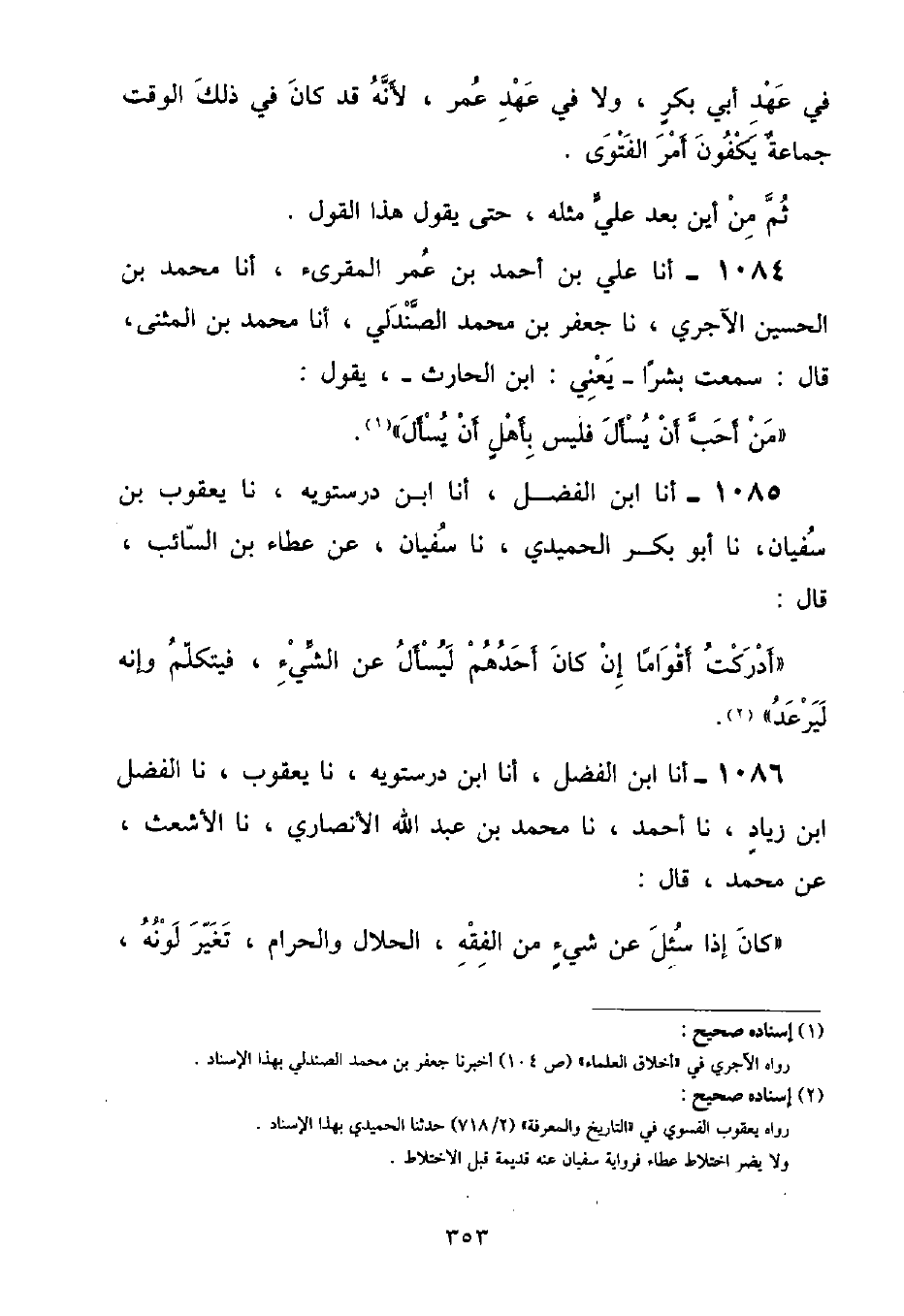 أنا ابْنُ الْفَضْلِ , أنا ابْنُ دَرَسْتُوَيْهِ , نا يَعْقُوبُ بْنُ سُفْيَانَ , نا أَبُو بَكْرٍ الْحُمَيْدِيُّ , نا سُفْيَانُ , عَنْ عَطَاءِ بْنِ السَّائِبِ , قَالَ: «أَدْرَكْتُ أَقْوَامًا إِنْ كَانَ أَحَدُهُمْ لَيُسْأَلُ عَنِ الشَّيْءِ , فَيَتَكَلَّمُ وَإِنَّهُ لِيَرْعَدُ»