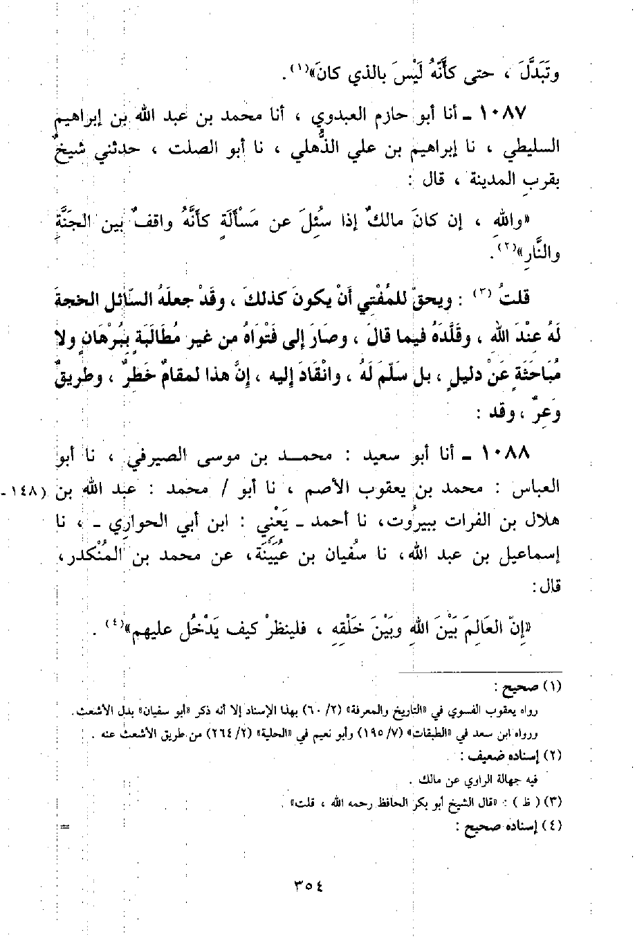 أنا أَبُو حَازِمٍ الْعَبْدَوِيُّ , أنا مُحَمَّدُ بْنُ عَبْدِ اللَّهِ بْنِ إِبْرَاهِيمَ السَّلِيطِيُّ , نا إِبْرَاهِيمُ بْنُ عَلِيٍّ الذُّهْلِيُّ , نا أَبُو الصَّلْتِ , حَدَّثَنِي شَيْخٌ , بِقُرْبِ الْمَدِينَةِ , قَالَ: «وَاللَّهِ , إِنْ كَانَ مَالِكٌ إِذَا سُئِلَ عَنْ مَسْأَلَةٍ كَأَنَّهُ وَاقِفٌ بَيْنَ الْجَنَّةِ وَالنَّارِ» قُلْتُ: وَيَحِقُّ لِلْمُفْتِي أَنْ يَكُونَ كَذَلِكَ , وَقَدْ جَعَلَهُ السَّائِلُ الْحُجَّةَ لَهُ عِنْدَ اللَّهِ , وَقَلَّدَهُ فِيمَا قَالَ , وَصَارَ إِلَى فَتْوَاهُ مِنْ غَيْرِ مُطَالَبَةٍ بِبُرْهَانٍ وَلَا مُبَاحَثَةٍ عَنْ دَلِيلٍ , بَلْ سَلَّمَ لَهُ , وَانْقَادَ إِلَيْهِ , إِنَّ هَذَا لَمَقَامٌ خَطَرٌ , وَطَرِيقٌ وَعِرٌ