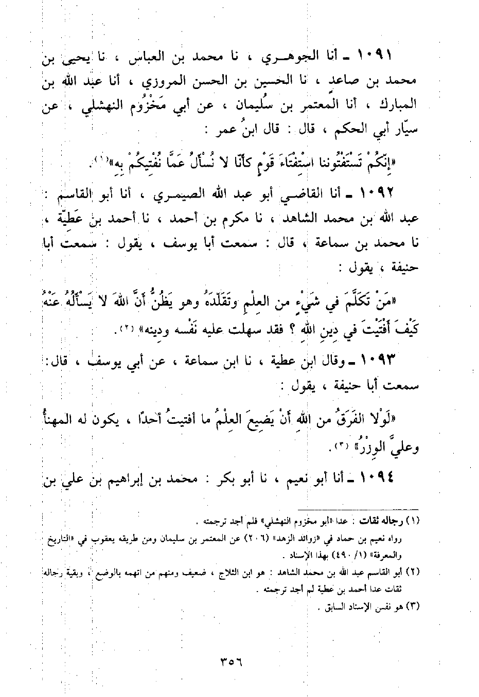 أنا الْجَوْهَرِيُّ , نا مُحَمَّدُ بْنُ الْعَبَّاسِ , نا يَحْيَى بْنُ مُحَمَّدِ بْنِ صَاعِدٍ , نا الْحُسَيْنُ بْنُ الْحَسَنِ الْمَرْوَزِيُّ , أنا عَبْدُ اللَّهِ بْنُ الْمُبَارَكِ , أنا الْمُعْتَمِرُ بْنُ سُلَيْمَانَ , عَنْ أَبِي مَخْزُومٍ النَّهْشَلِيِّ , عَنْ سَيَّارٍ أَبِي الْحَكَمِ , قَالَ: قَالَ ابْنُ عُمَرَ: «إِنَّكُمْ تَسْتَفْتُونَنَا اسْتِفْتَاءَ قَوْمٍ كَأَنَّا لَا نَسْأَلُ عَمَّا نُفْتِيكُمْ بِهِ»