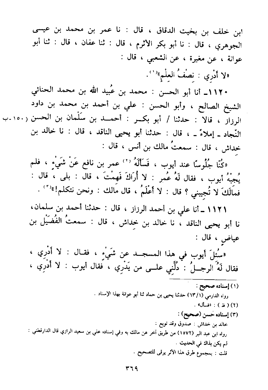 أنا أَبُو الْحَسَنِ مُحَمَّدُ بْنُ عُبَيْدِ اللَّهِ بْنِ مُحَمَّدٍ الشَّيْخُ الصَّالِحُ , وَأَبُو الْحَسَنِ عَلِيُّ بْنُ أَحْمَدَ بْنِ مُحَمَّدِ بْنِ دَاوُدَ الرَّزَّازُ , قَالَا: حَدَّثَنَا أَبُو بَكْرٍ أَحْمَدُ بْنُ سَلْمَانَ بْنِ الْحَسَنِ النِّجَادُ إِمْلَاءً , قَالَ: حَدَّثَنَا أَبُو يَحْيَى النَّاقِدُ , قَالَ: نَا خَالِدُ بْنُ خِدَاشٍ , قَالَ: سَمِعْتُ مَالِكَ بْنَ أَنَسٍ , قَالَ: " كُنَّا جُلُوسًا عِنْدَ أَيُّوبَ , فَسَأَلَهُ عُمَرُ بْنُ نَافِعٍ عَنْ شَيْءٍ , فَلَمْ يُجِبْهُ أَيُّوبُ , فَقَالَ لَهُ عُمَرُ: لَا أَرَاكَ فَهِمْتَ , قَالَ: بَلَى , قَالَ: فَمَا لَكَ لَا تُجِيبُنِي؟ قَالَ: لَا أَعْلَمُ " قَالَ مَالِكٌ: وَنَحْنُ نَتَكَلَّمُ